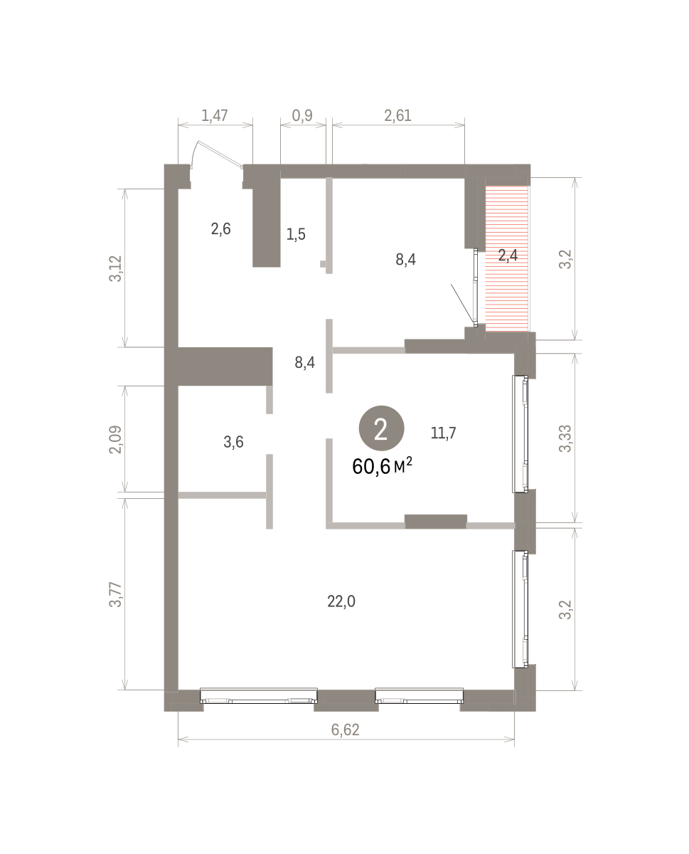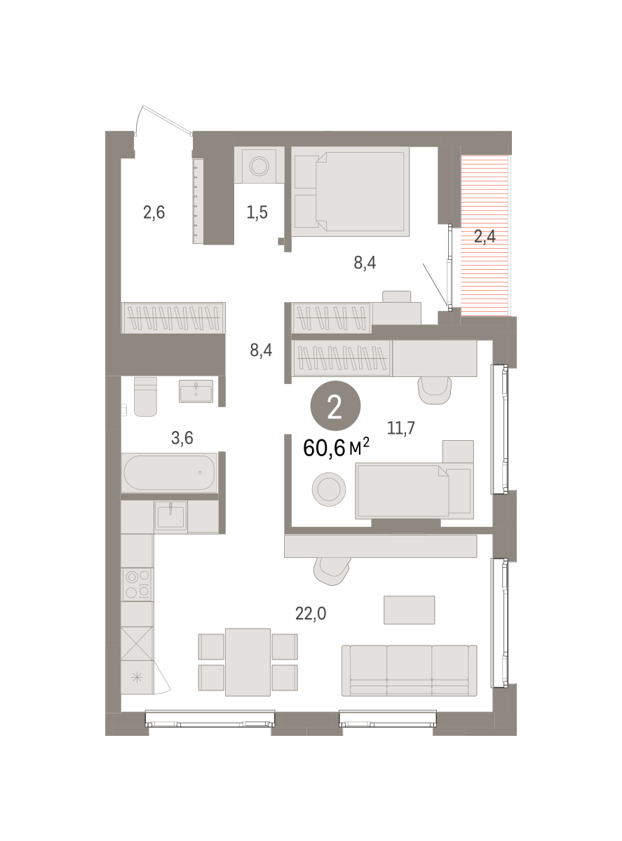 Продаётся с кладовой. Квартира с кухней-гостиной и двумя спальнями в квартале «Траектория». Особенности планировки: лоджия, постирочная, предчистовая отделка, разнесённые спальни. № квартиры в нашей базе: МНВ01-Ж1.17.2.