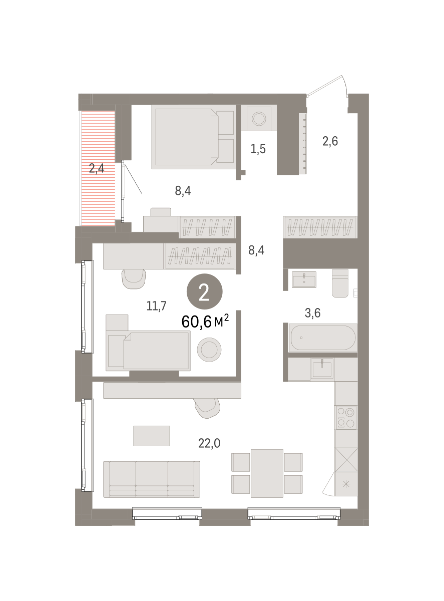Продаётся с кладовой. Квартира с кухней-гостиной и двумя спальнями в квартале «Траектория». Особенности планировки: вид во двор, лоджия, постирочная, предчистовая отделка, разнесённые спальни. № квартиры в нашей базе: МНВ01-Ж1.19.5.