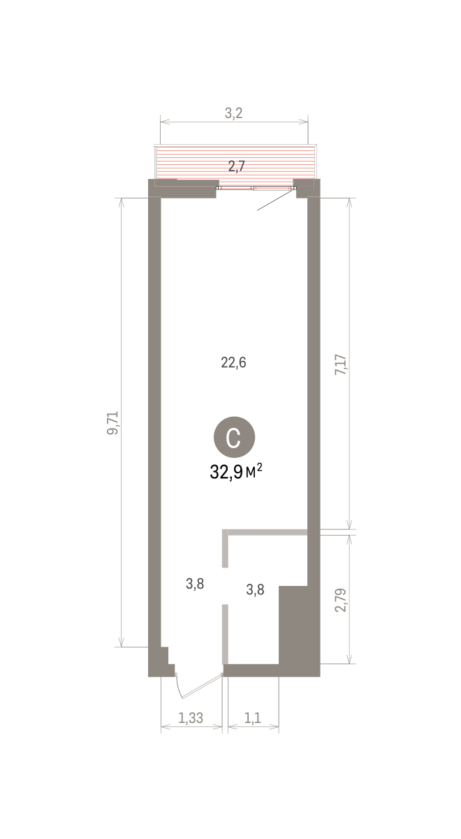 Студия в квартале «Траектория». Особенности планировки: балкон, предчистовая отделка. № квартиры в нашей базе: МНВ01-Ж1.17.10.