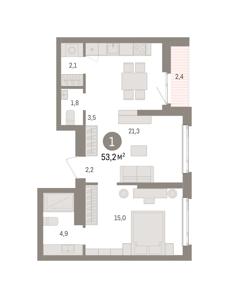 Продаётся с кладовой. Квартира с кухней-гостиной и одной спальней в квартале «Траектория». Особенности планировки: гардеробная, лоджия, мастер-спальня, постирочная, предчистовая отделка. № квартиры в нашей базе: МНВ01-Ж1.21.1.