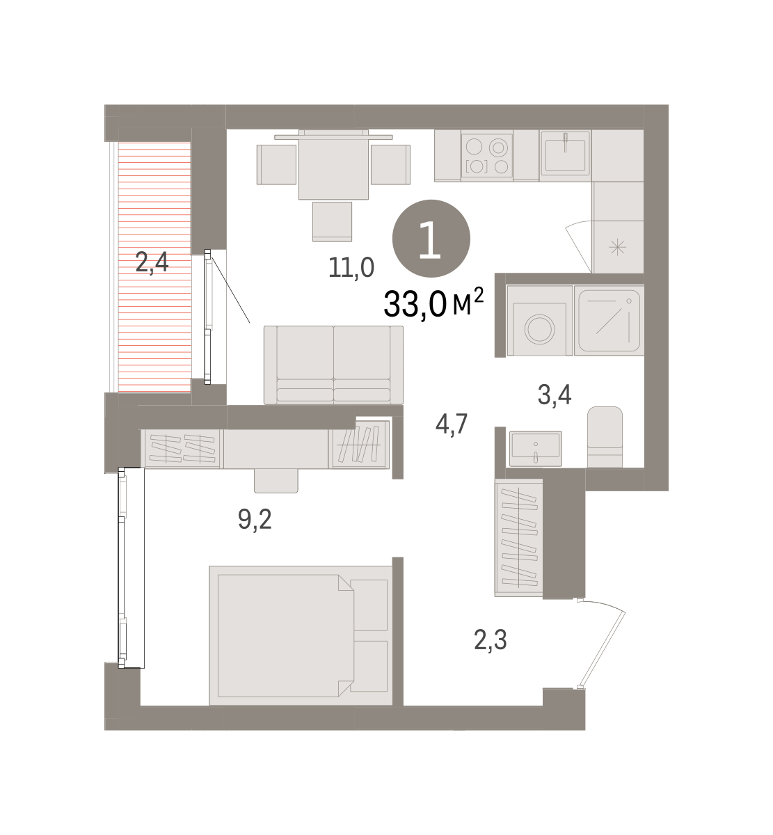 Квартира с кухней-гостиной и одной спальней в квартале «Траектория». Особенности планировки: лоджия, предчистовая отделка. № квартиры в нашей базе: МНВ01-Ж1.17.6.