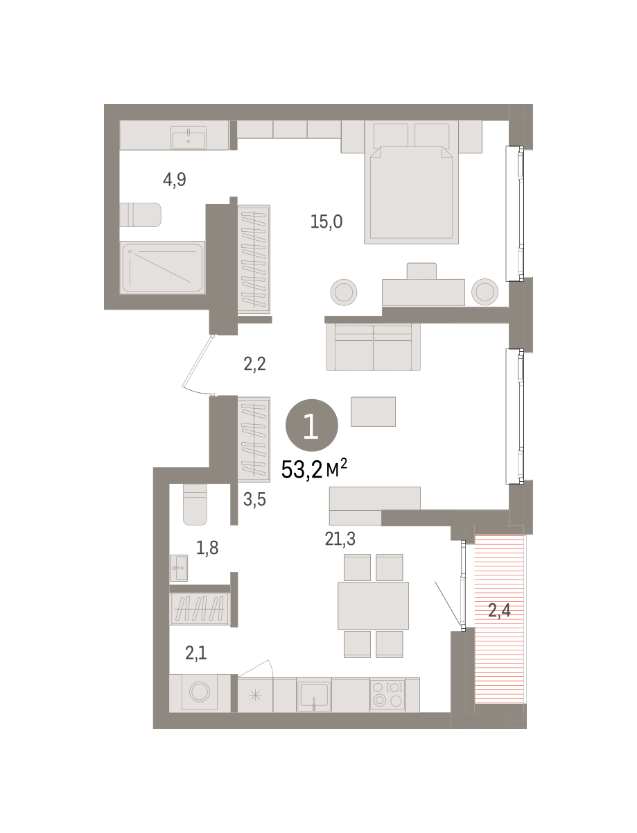 Продаётся с кладовой. Квартира с кухней-гостиной и одной спальней в квартале «Траектория». Особенности планировки: гардеробная, лоджия, мастер-спальня, постирочная, предчистовая отделка. № квартиры в нашей базе: МНВ01-Ж1.21.8.