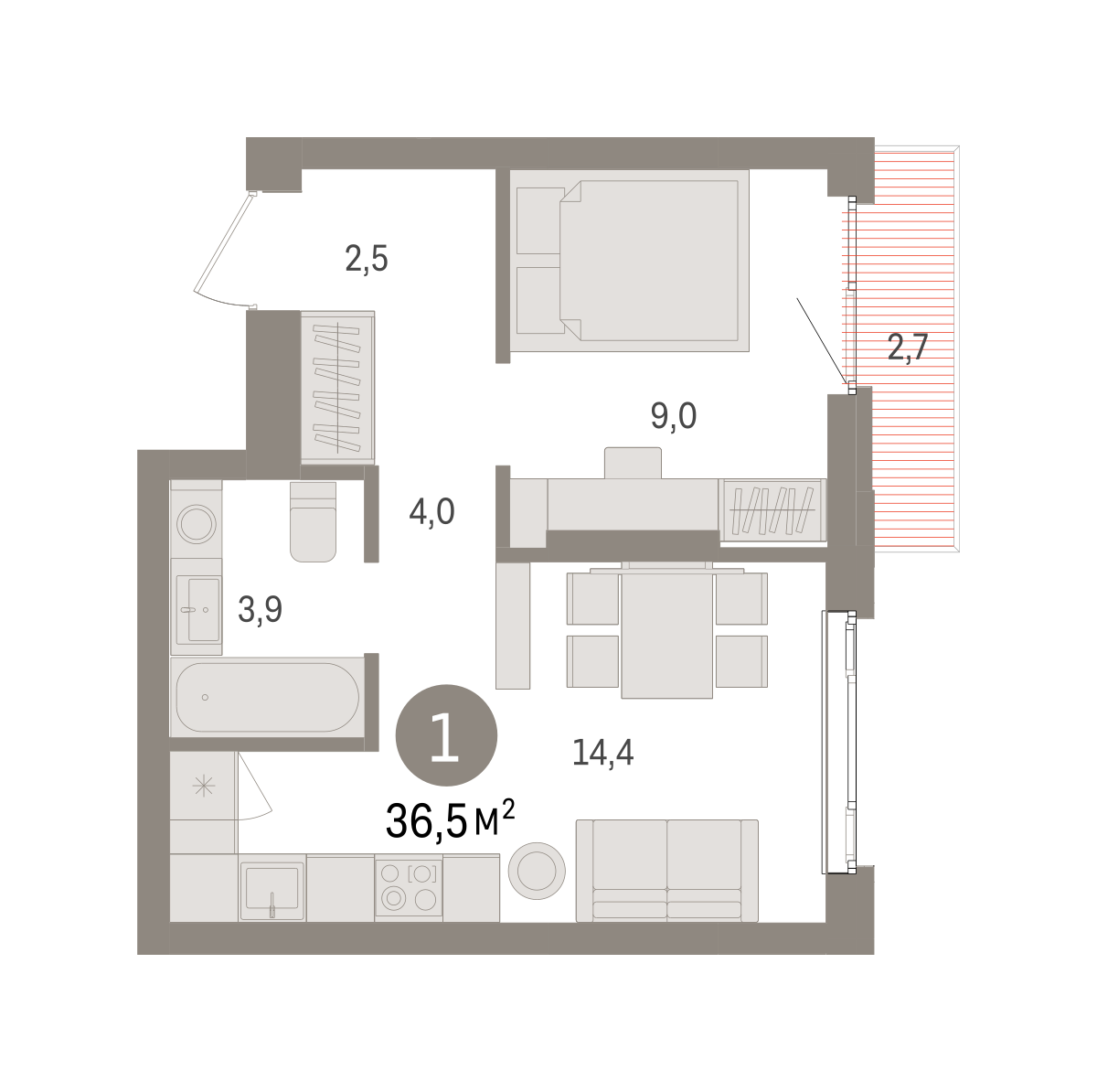 Квартира с кухней-гостиной и одной спальней в квартале «Траектория». Особенности планировки: балкон, предчистовая отделка. № квартиры в нашей базе: МНВ01-Ж1.7.8.