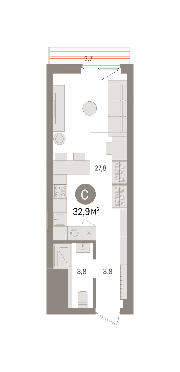 Студия в квартале «Траектория». Особенности планировки: балкон, предчистовая отделка. № квартиры в нашей базе: МНВ01-Ж1.18.9.
