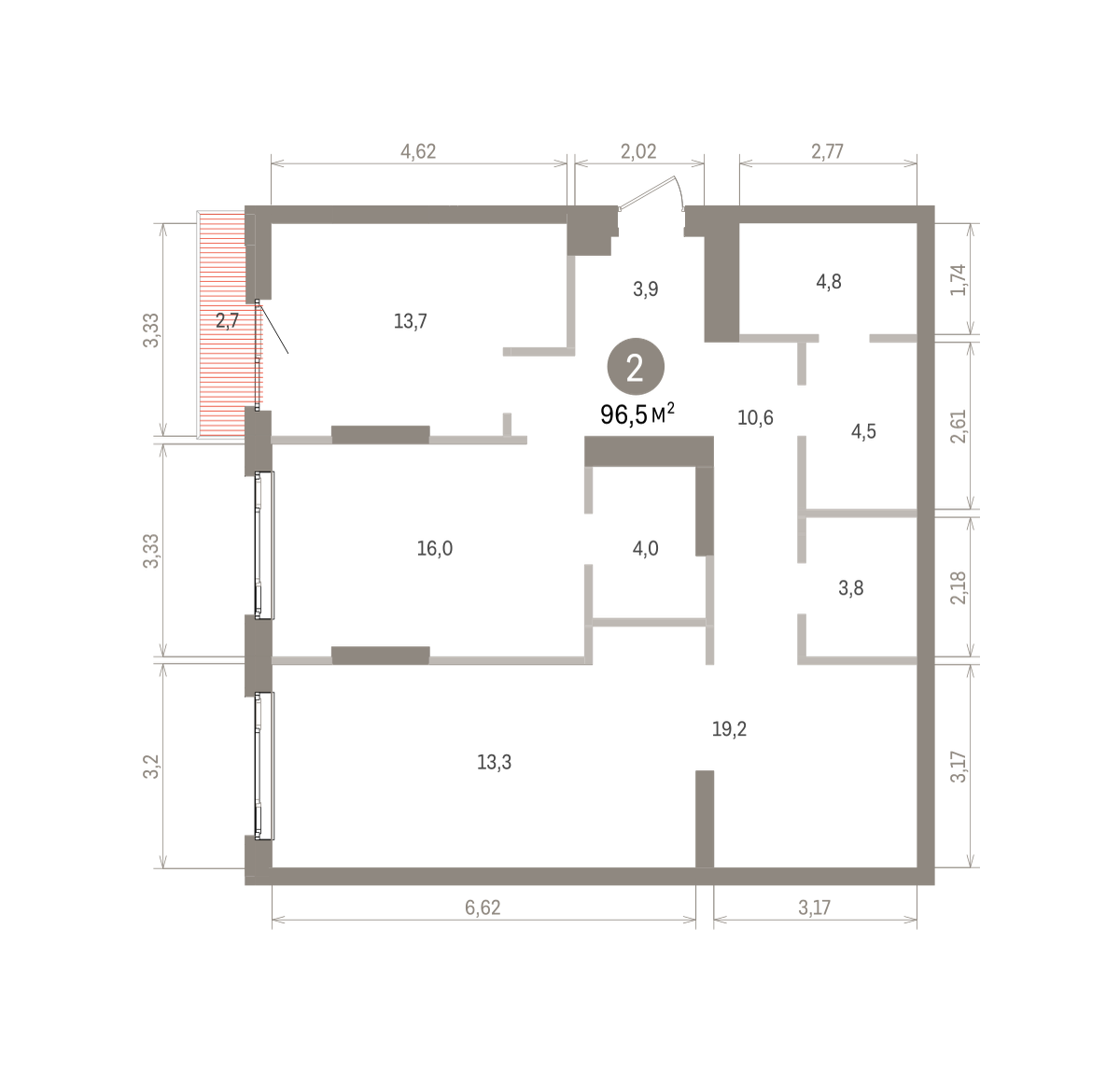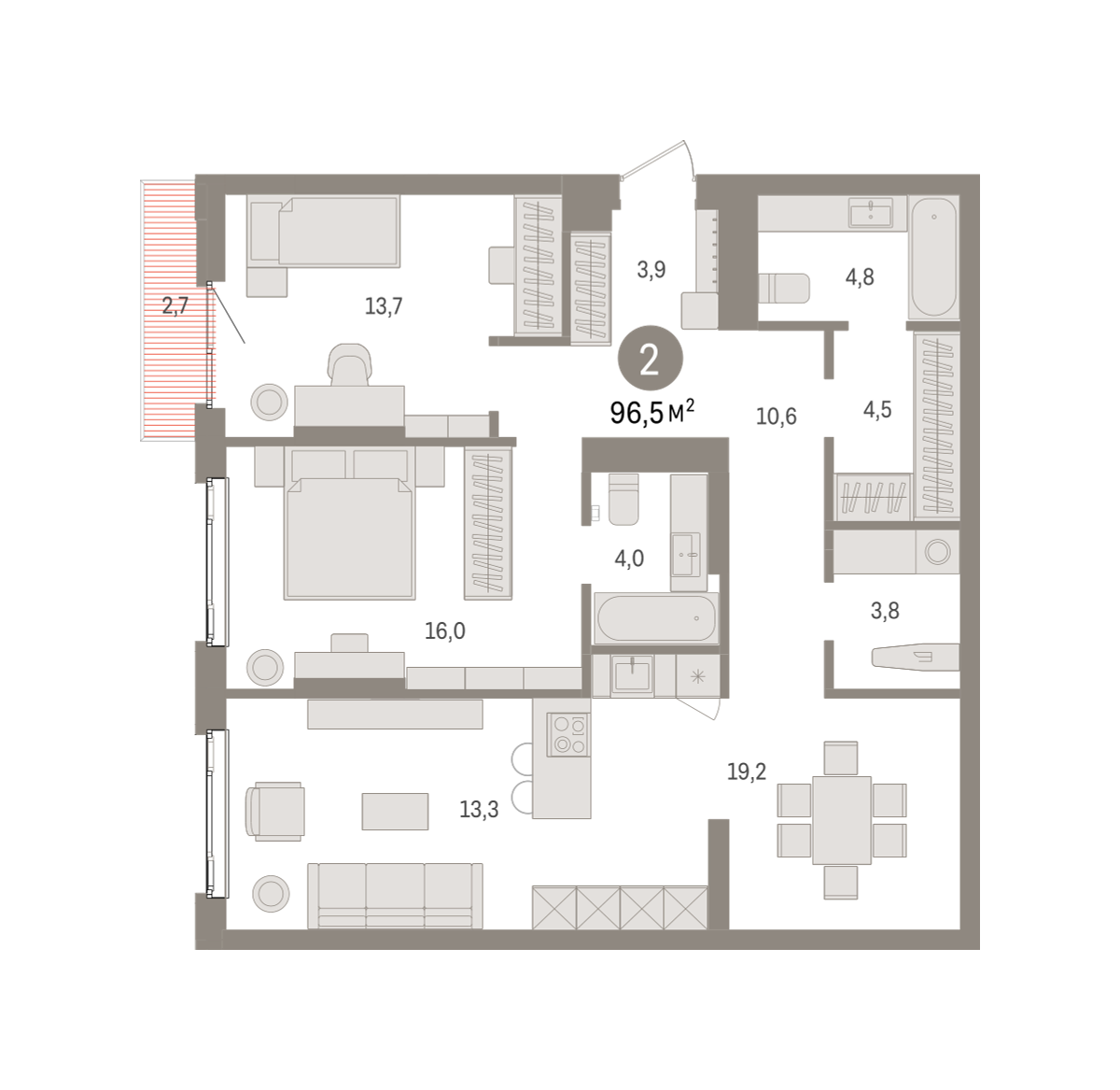 Квартира с кухней-гостиной и двумя спальнями в квартале «Траектория». Особенности планировки: балкон, вид во двор, гардеробная, мастер-спальня, постирочная, предчистовая отделка, разнесённые спальни. № квартиры в нашей базе: МНВ01-Ж1.9.3.
