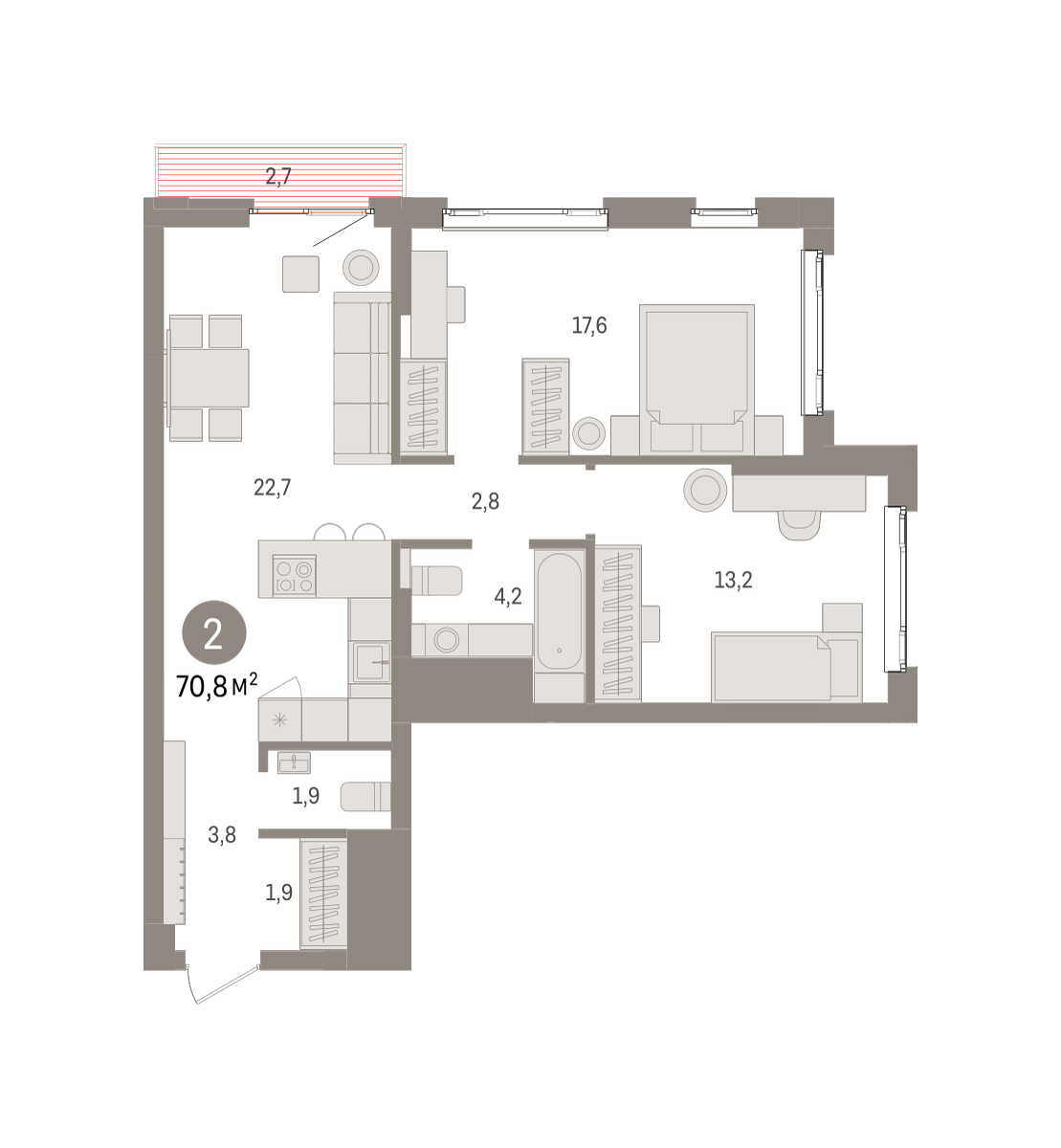 Продаётся с кладовой. Квартира с кухней-гостиной и двумя спальнями в квартале «Траектория». Особенности планировки: балкон, второй санузел, гардеробная, предчистовая отделка, разнесённые спальни. № квартиры в нашей базе: МНВ01-Ж1.22.7.