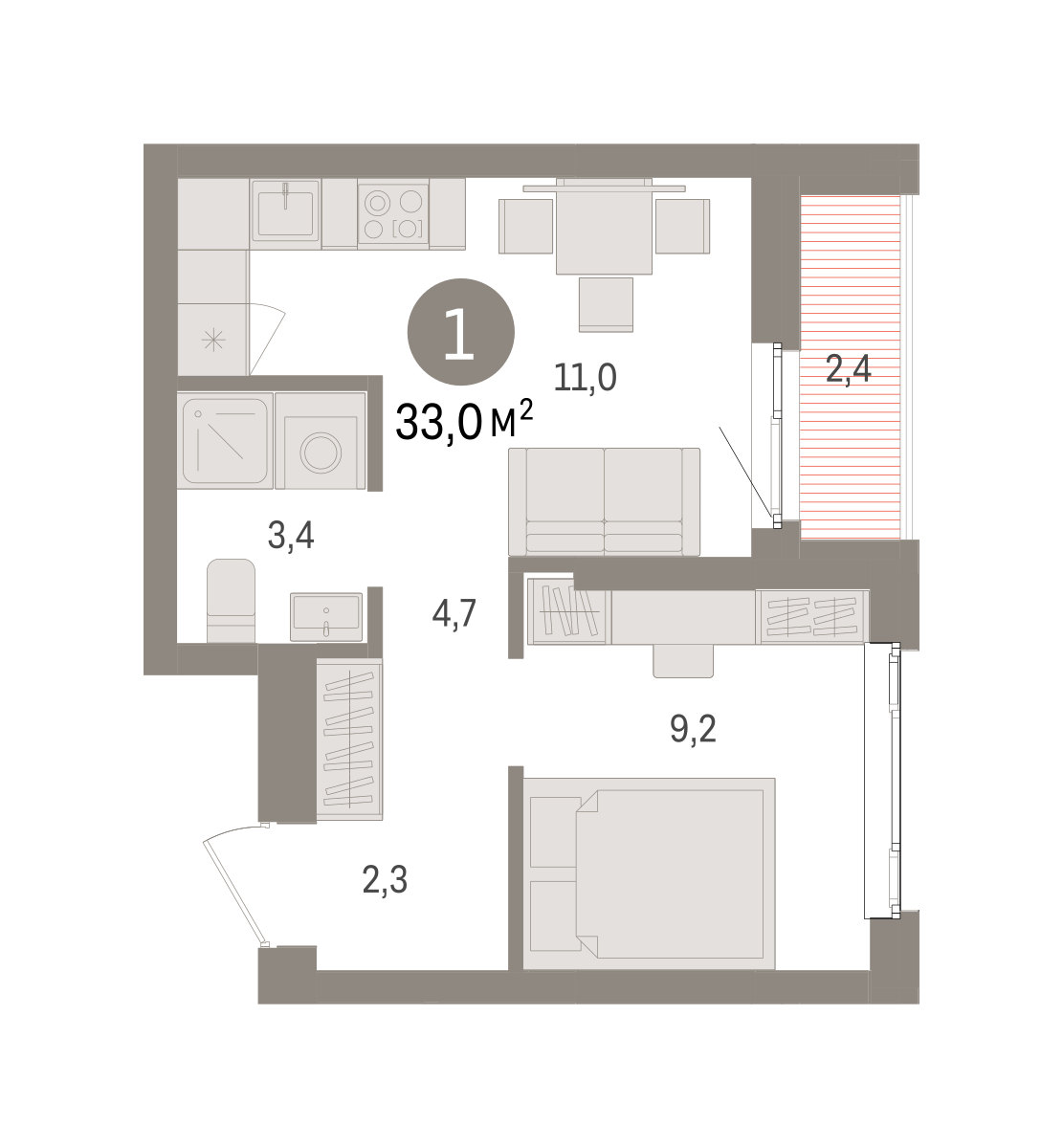 Квартира с кухней-гостиной и одной спальней в квартале «Траектория». Особенности планировки: лоджия, предчистовая отделка. № квартиры в нашей базе: МНВ01-Ж1.18.1.
