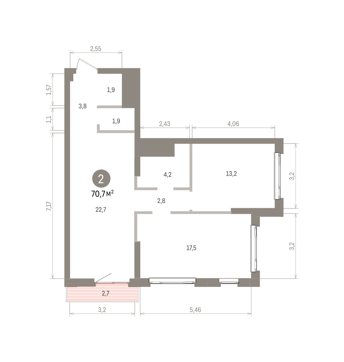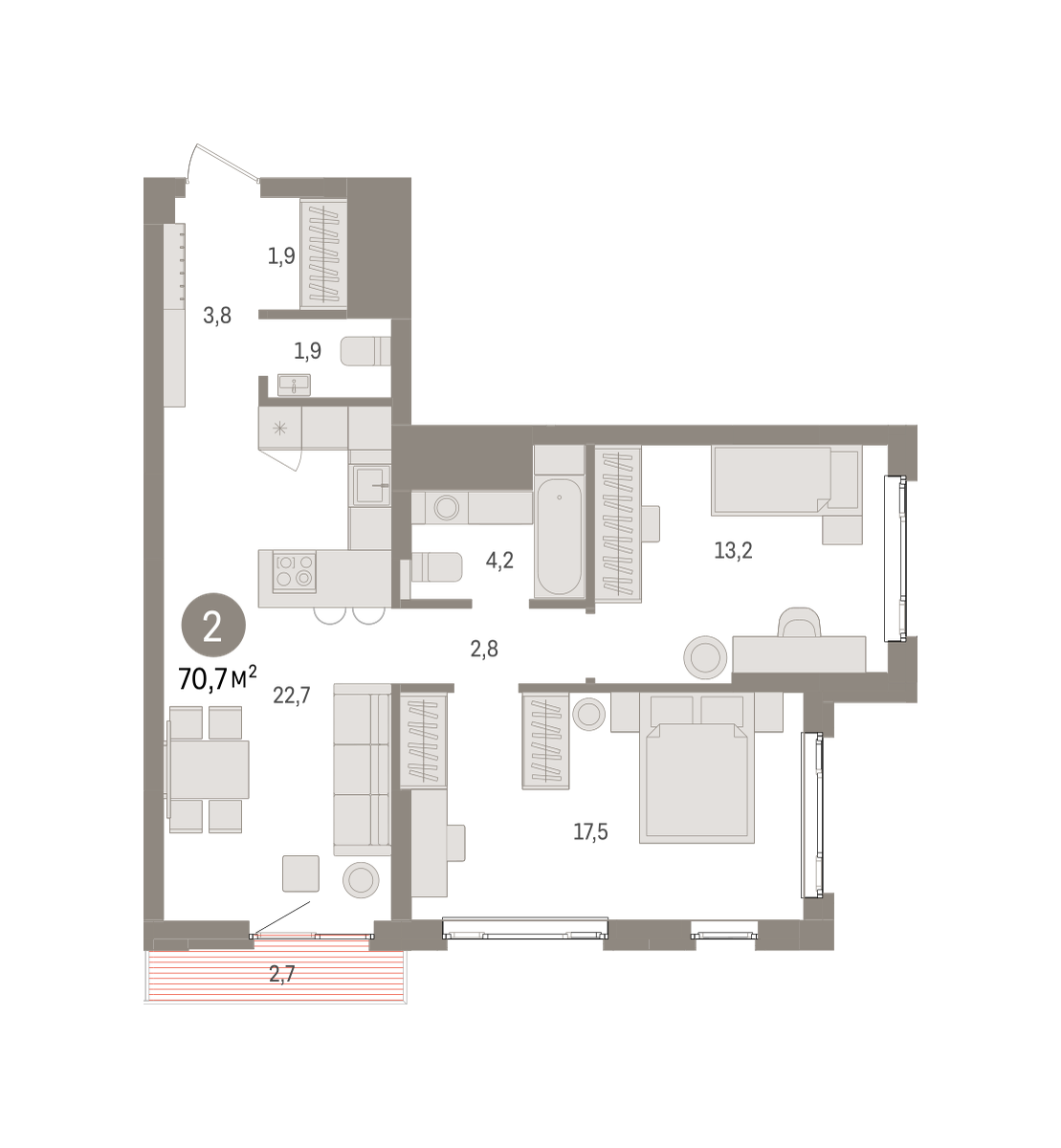 Продаётся с кладовой. Квартира с кухней-гостиной и двумя спальнями в квартале «Траектория». Особенности планировки: балкон, второй санузел, гардеробная, предчистовая отделка, разнесённые спальни. № квартиры в нашей базе: МНВ01-Ж1.23.2.