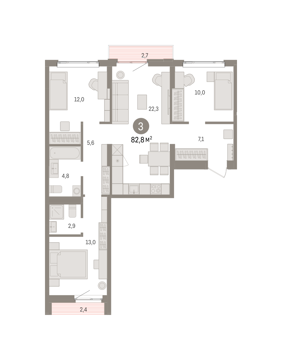 Квартира с кухней-гостиной и тремя спальнями в квартале «Траектория». Особенности планировки: балкон, вид во двор, лоджия, мастер-спальня, окна на две стороны, предчистовая отделка, разнесённые спальни. № квартиры в нашей базе: МНВ01-Ж4.5.5.
