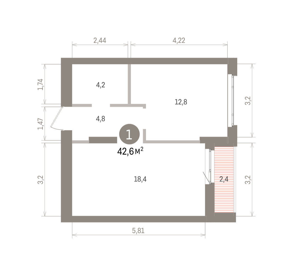 Квартира с кухней-гостиной и одной спальней в квартале «Траектория». Особенности планировки: лоджия, предчистовая отделка. № квартиры в нашей базе: МНВ01-Ж12.13.3.
