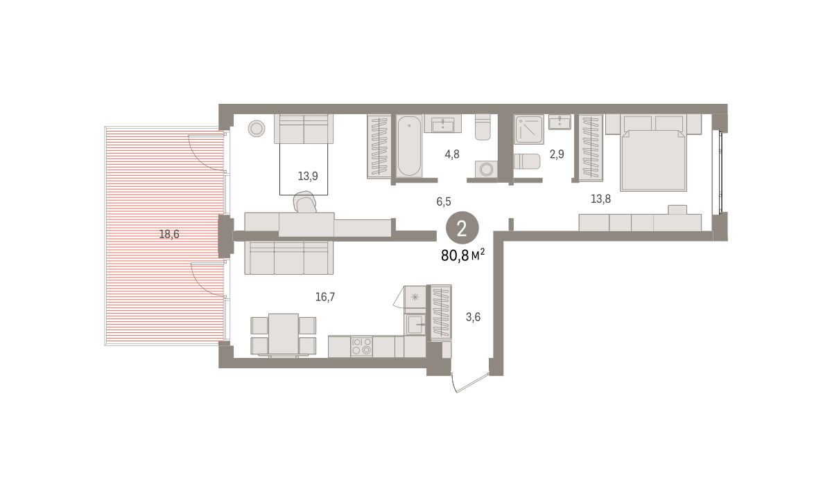 Квартира с кухней-гостиной и двумя спальнями в квартале «Траектория». Особенности планировки: вид во двор, мастер-спальня, окна на две стороны, потолки 3 м и выше, предчистовая отделка, разнесённые спальни, терраса.