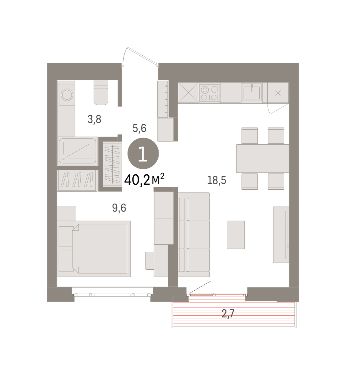 Квартира с кухней-гостиной и одной спальней в квартале «Траектория». Особенности планировки: балкон, вид во двор, предчистовая отделка. № квартиры в нашей базе: МНВ01-Ж14.5.2.
