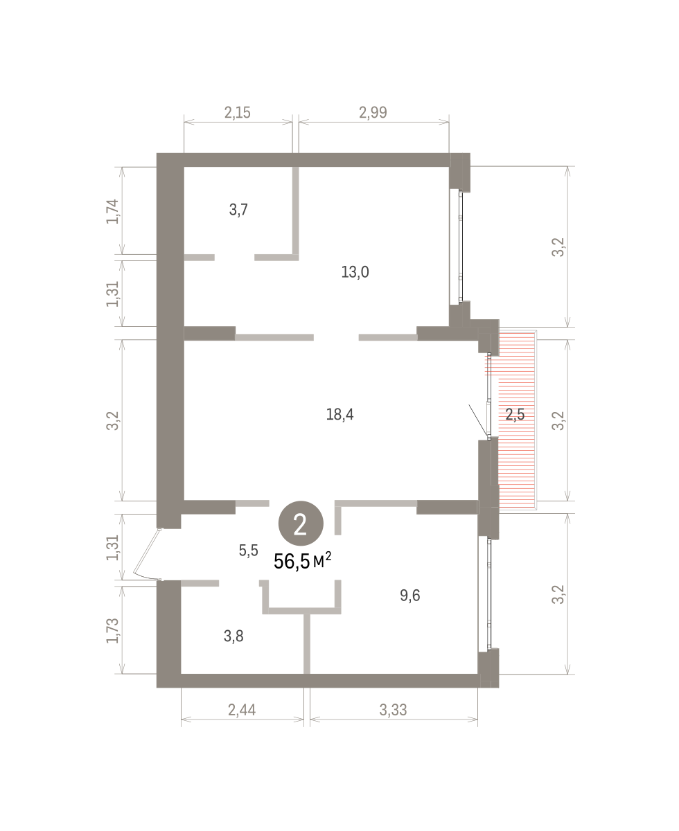 Продаётся с кладовой. Квартира с кухней-гостиной и двумя спальнями в квартале «Траектория». Особенности планировки: балкон, гардеробная, мастер-спальня, предчистовая отделка, разнесённые спальни. № квартиры в нашей базе: МНВ01-Ж13.5.2.