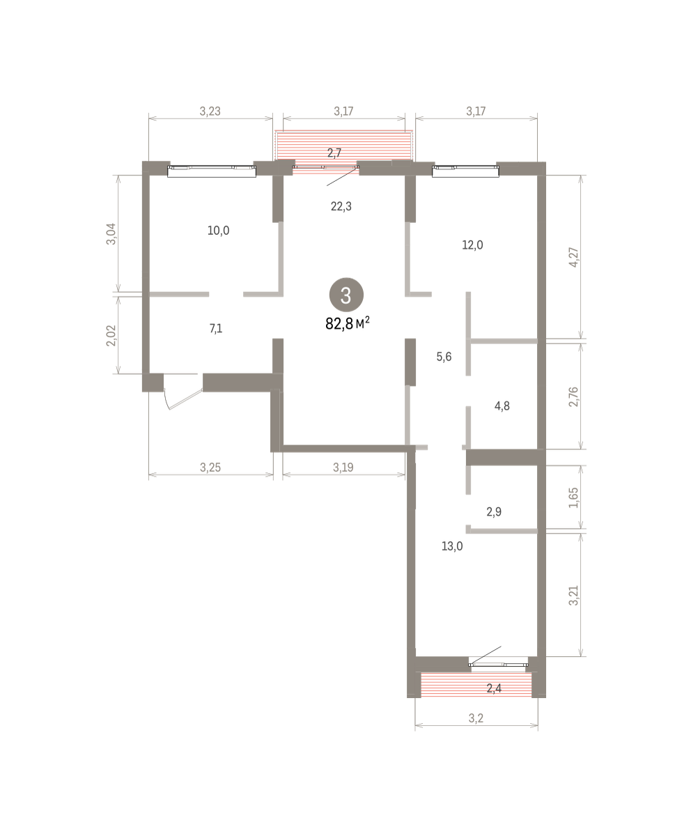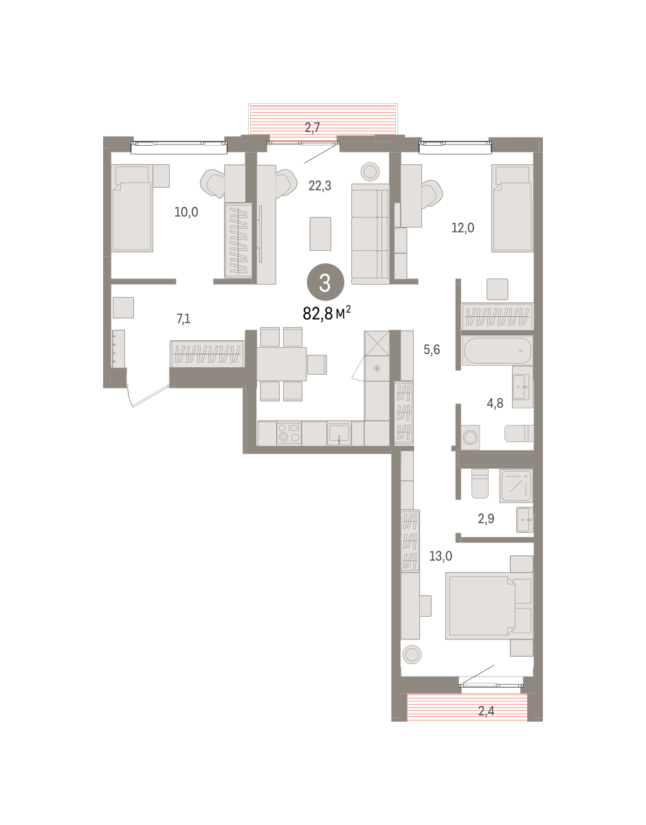 Квартира с кухней-гостиной и тремя спальнями в квартале «Траектория». Особенности планировки: балкон, вид во двор, лоджия, мастер-спальня, окна на две стороны, предчистовая отделка, разнесённые спальни. № квартиры в нашей базе: МНВ01-Ж4.5.1.
