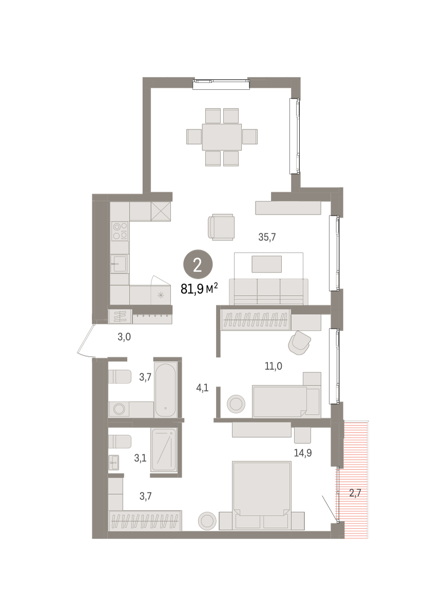 Квартира с кухней-гостиной и двумя спальнями в квартале «Траектория». Особенности планировки: балкон, гардеробная, мастер-спальня, предчистовая отделка, разнесённые спальни. № квартиры в нашей базе: МНВ01-Ж3.14.2.