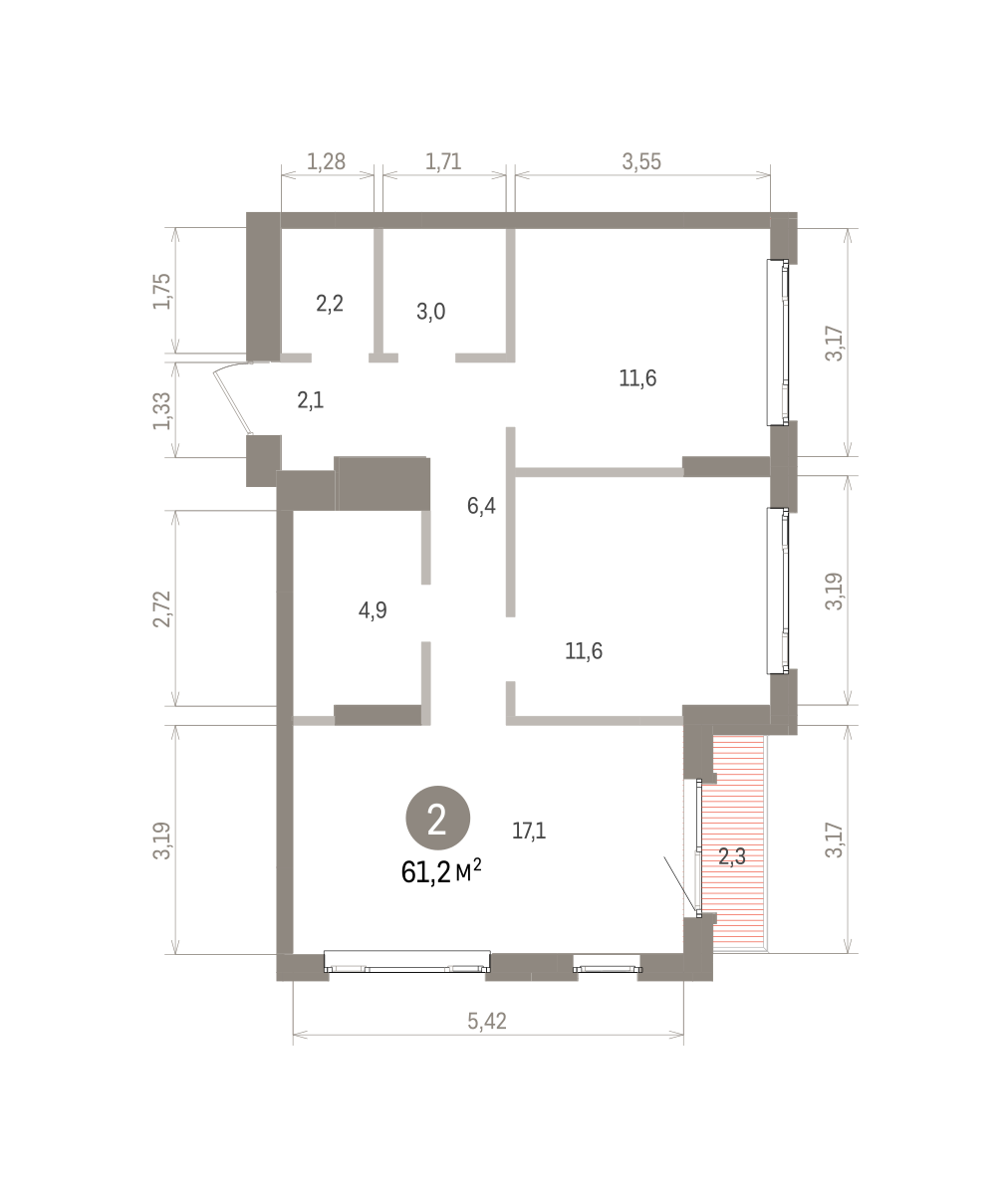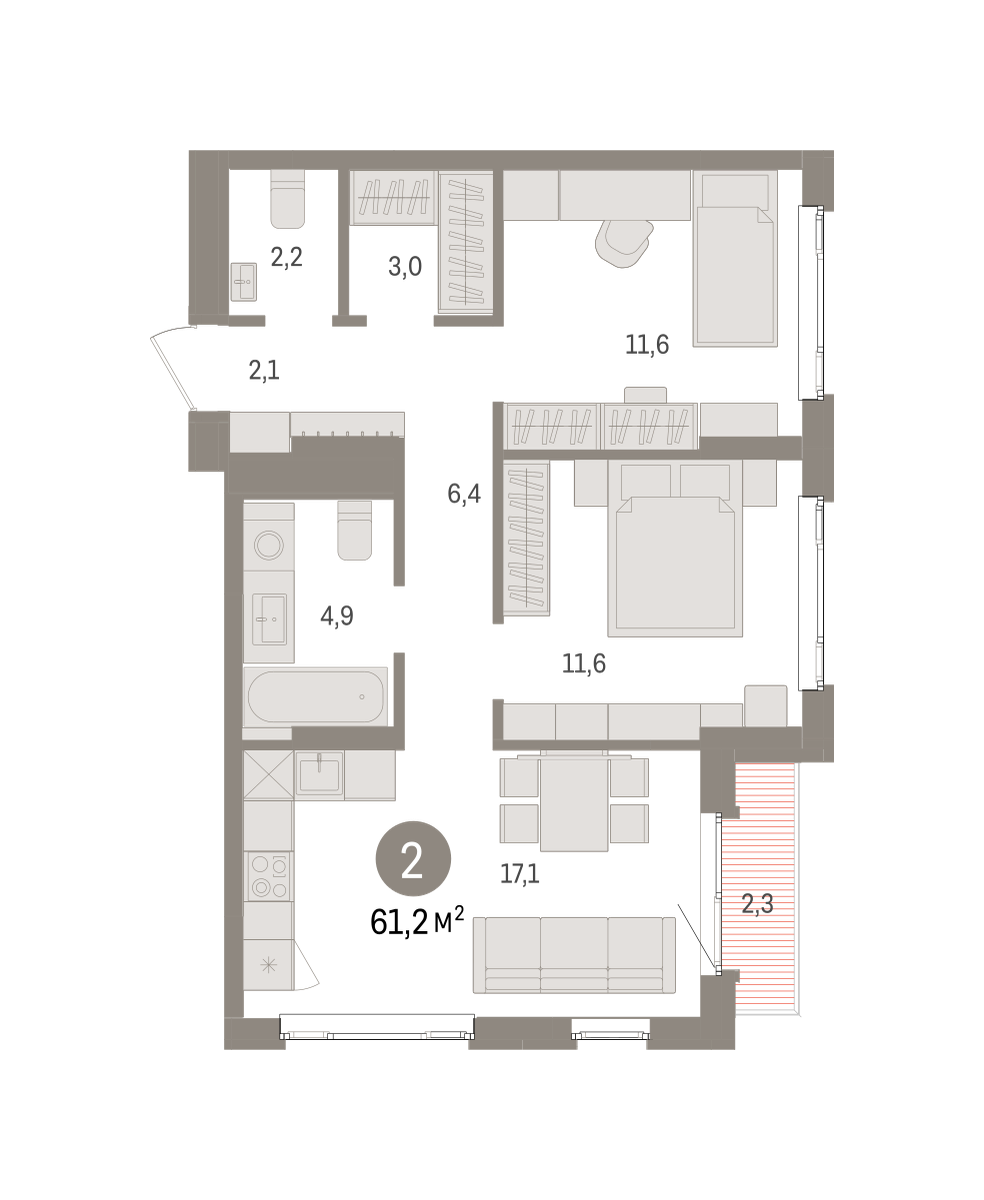 Продаётся с кладовой. Квартира с кухней-гостиной и двумя спальнями в квартале «Траектория». Особенности планировки: второй санузел, гардеробная, предчистовая отделка, разнесённые спальни, терраса на крыше. № квартиры в нашей базе: МНВ01-Ж3.13.5.