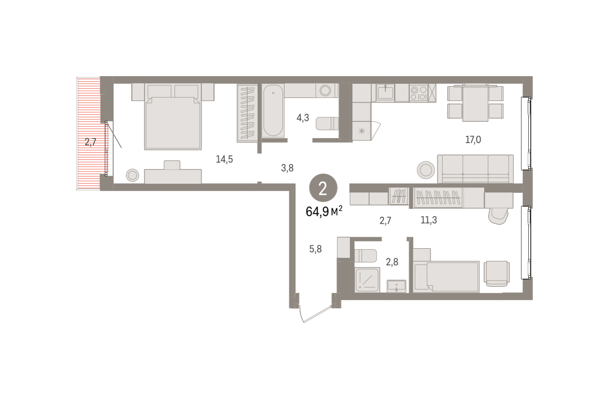 Квартира с кухней-гостиной и двумя спальнями в квартале «Траектория». Особенности планировки: балкон, вид во двор, второй санузел, окна на две стороны, предчистовая отделка, разнесённые спальни.