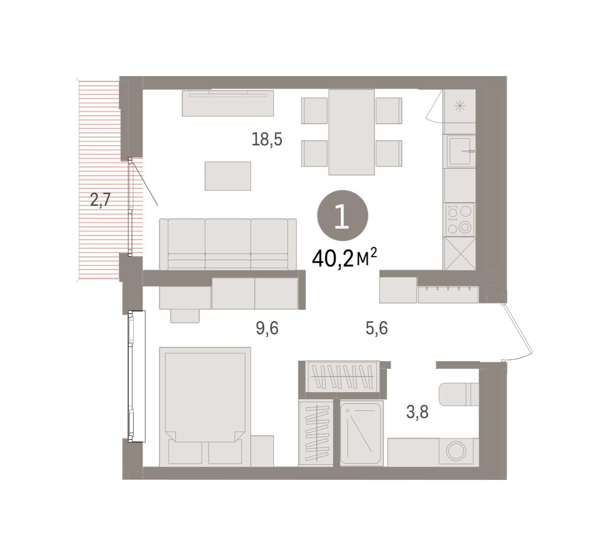 Квартира с кухней-гостиной и одной спальней в квартале «Траектория». Особенности планировки: балкон, предчистовая отделка. № квартиры в нашей базе: МНВ01-Ж5.6.7.