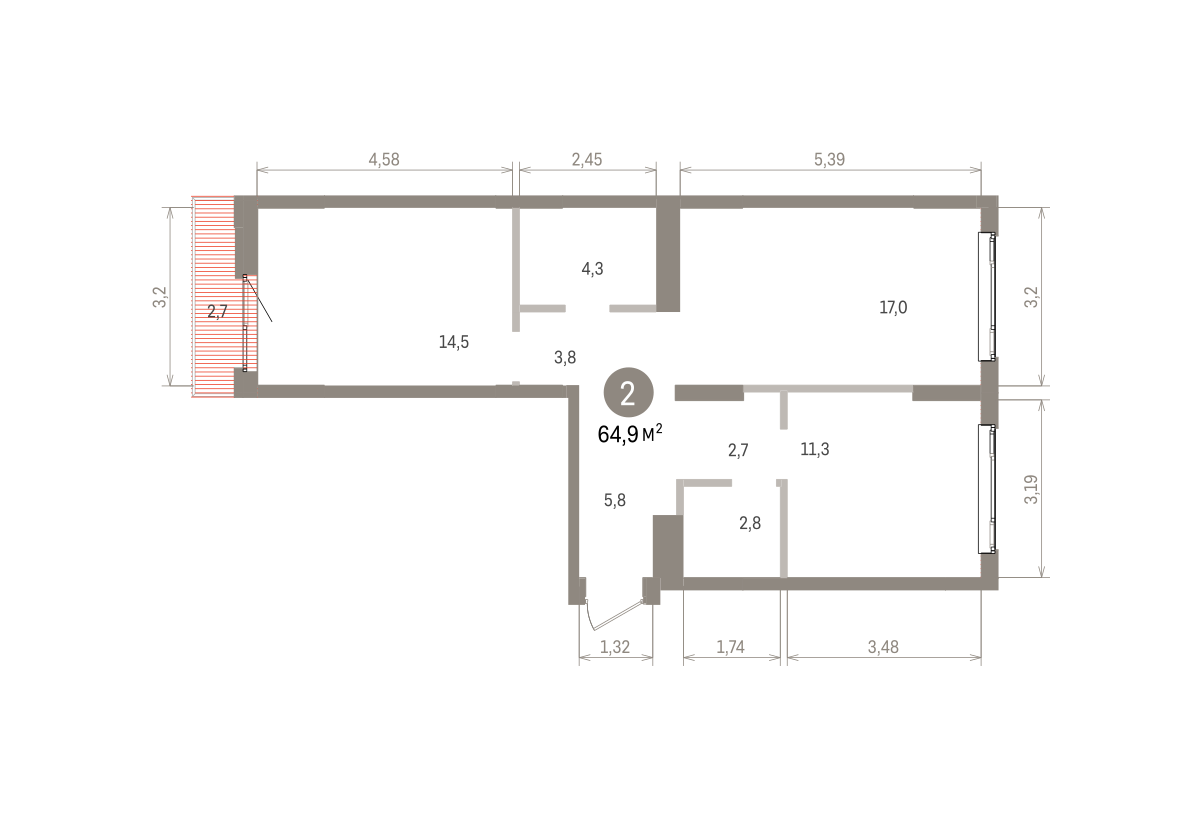 Квартира с кухней-гостиной и двумя спальнями в квартале «Траектория». Особенности планировки: балкон, вид во двор, второй санузел, окна на две стороны, предчистовая отделка, разнесённые спальни.