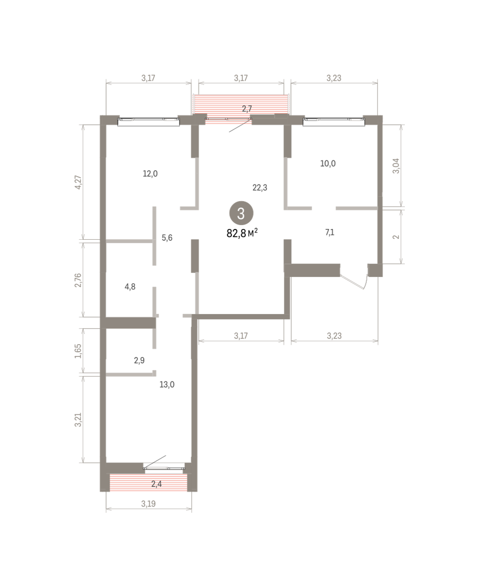 Квартира с кухней-гостиной и тремя спальнями в квартале «Траектория». Особенности планировки: балкон, вид во двор, лоджия, мастер-спальня, окна на две стороны, предчистовая отделка, разнесённые спальни. № квартиры в нашей базе: МНВ01-Ж4.4.5.