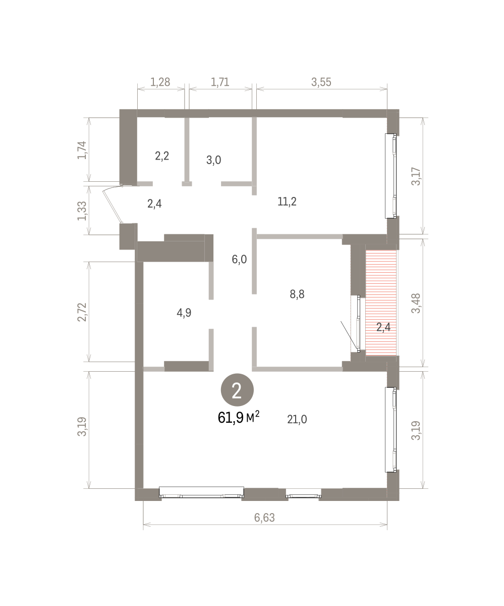 61.30 м² | 2 - 19 эт.