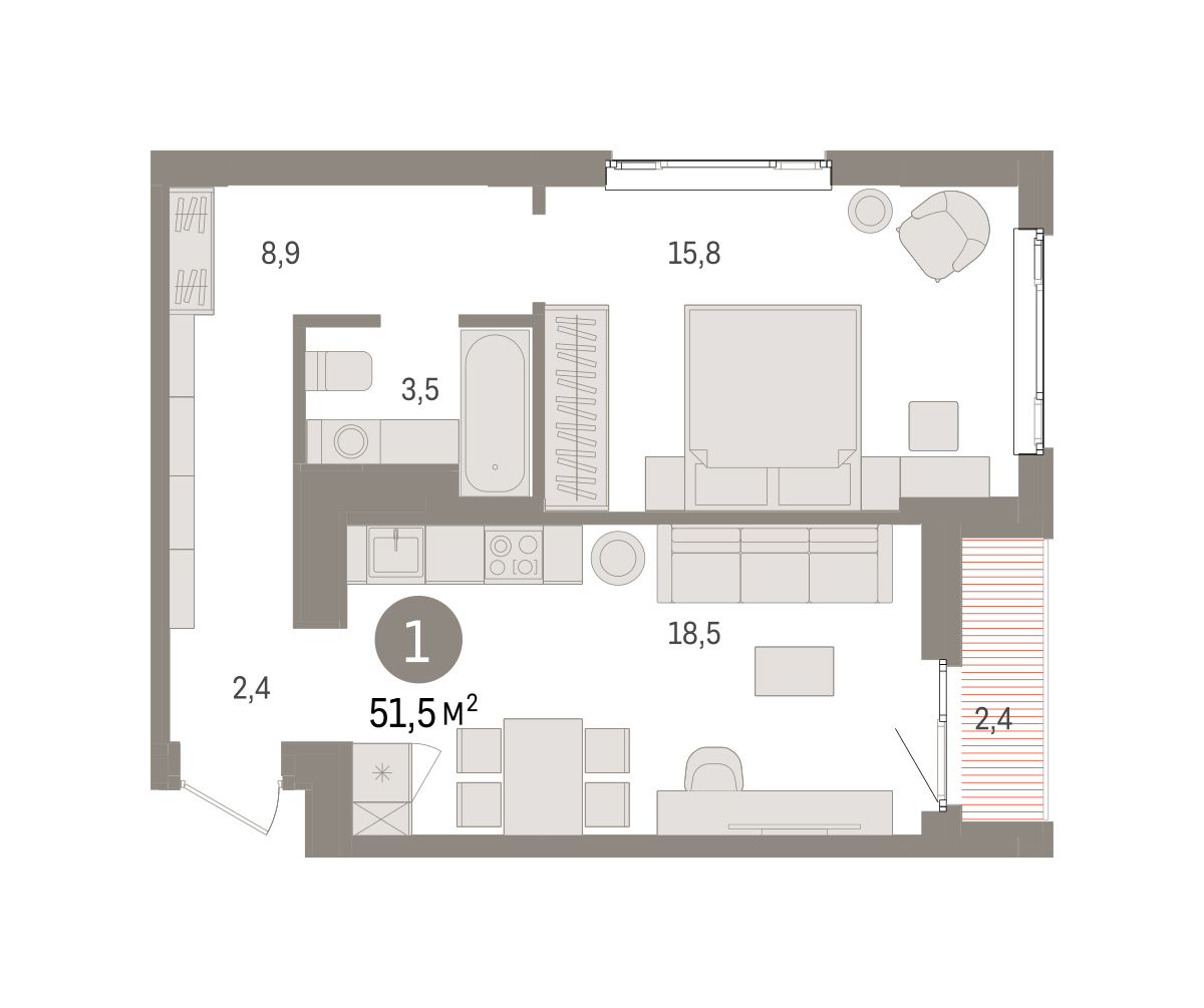 Продаётся с кладовой. Квартира с кухней-гостиной и одной спальней в квартале «Траектория». Особенности планировки: гардеробная, лоджия, предчистовая отделка. № квартиры в нашей базе: МНВ01-Ж3.9.2.