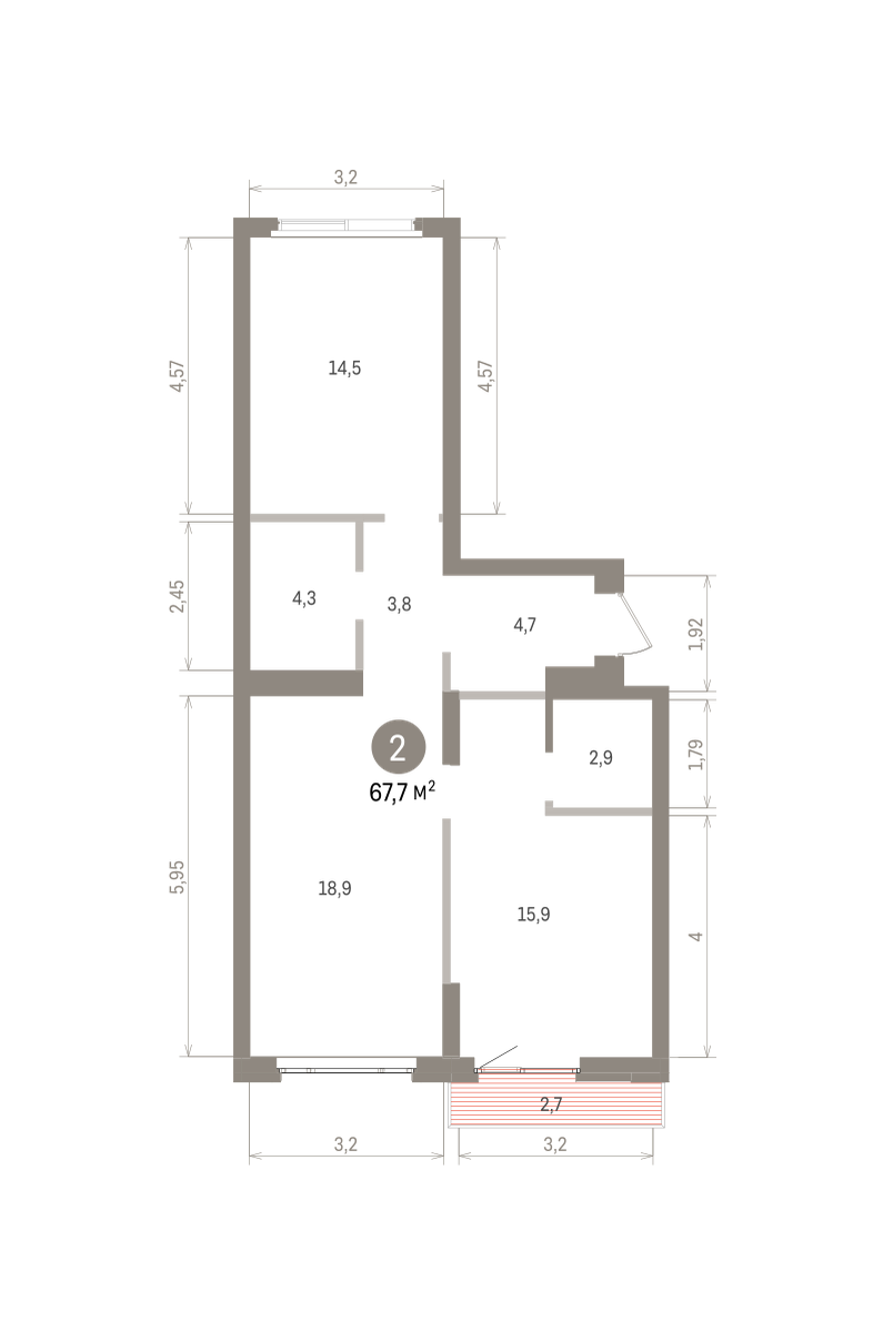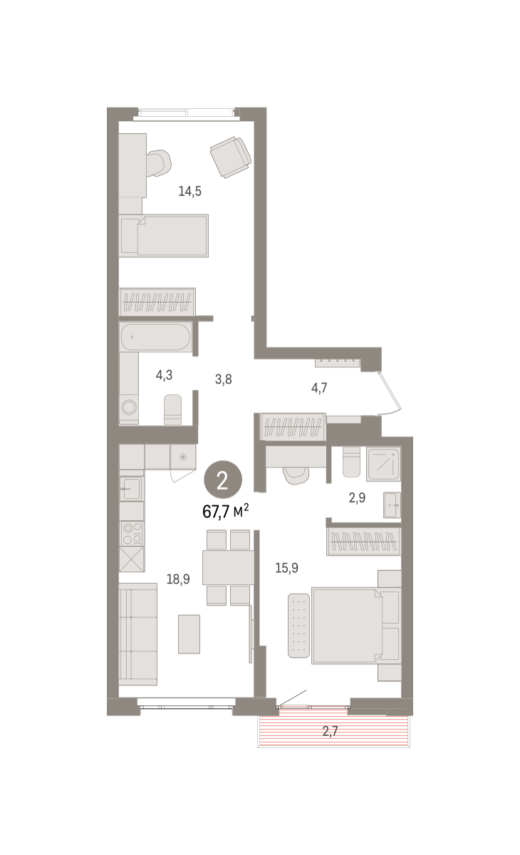 Квартира с кухней-гостиной и двумя спальнями в квартале «Траектория». Особенности планировки: балкон, вид во двор, мастер-спальня, окна на две стороны, предчистовая отделка, разнесённые спальни.