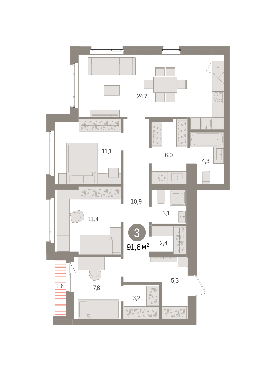 Квартира с кухней-гостиной и тремя спальнями в квартале «Траектория». Особенности планировки: второй санузел, гардеробная, лоджия, постирочная, предчистовая отделка, разнесённые спальни. № квартиры в нашей базе: МНВ01-Ж9.14.4.
