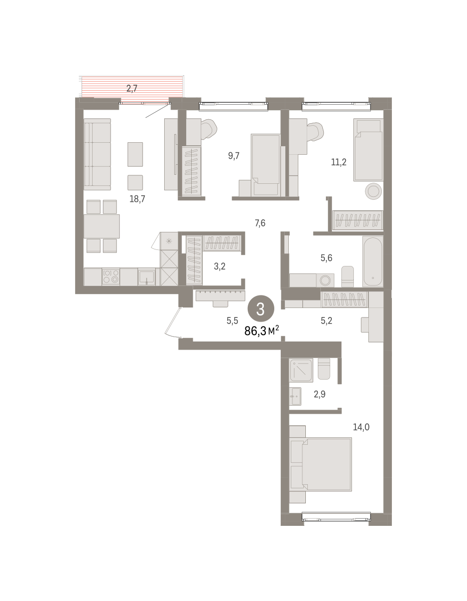 Квартира с кухней-гостиной и тремя спальнями в квартале «Траектория». Особенности планировки: балкон, гардеробная, мастер-спальня, окна на две стороны, предчистовая отделка, разнесённые спальни. № квартиры в нашей базе: МНВ01-Ж7.5.7.