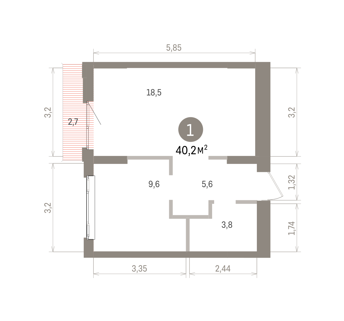 Квартира с кухней-гостиной и одной спальней в квартале «Траектория». Особенности планировки: балкон, предчистовая отделка. № квартиры в нашей базе: МНВ01-Ж5.7.7.