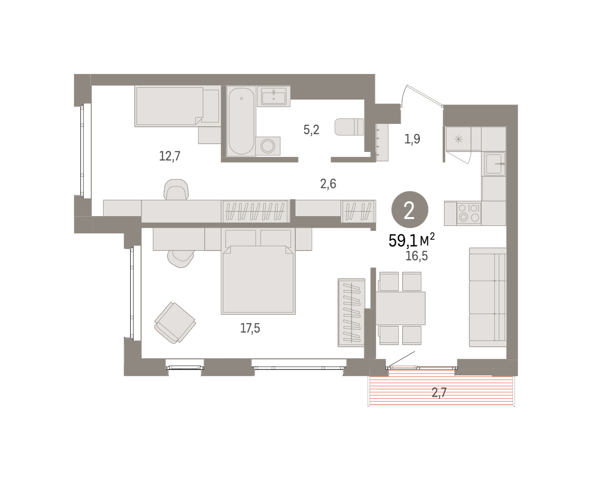 Продаётся с кладовой. Квартира с кухней-гостиной и двумя спальнями в квартале «Траектория». Особенности планировки: балкон, предчистовая отделка, разнесённые спальни. № квартиры в нашей базе: МНВ01-Ж9.14.2.