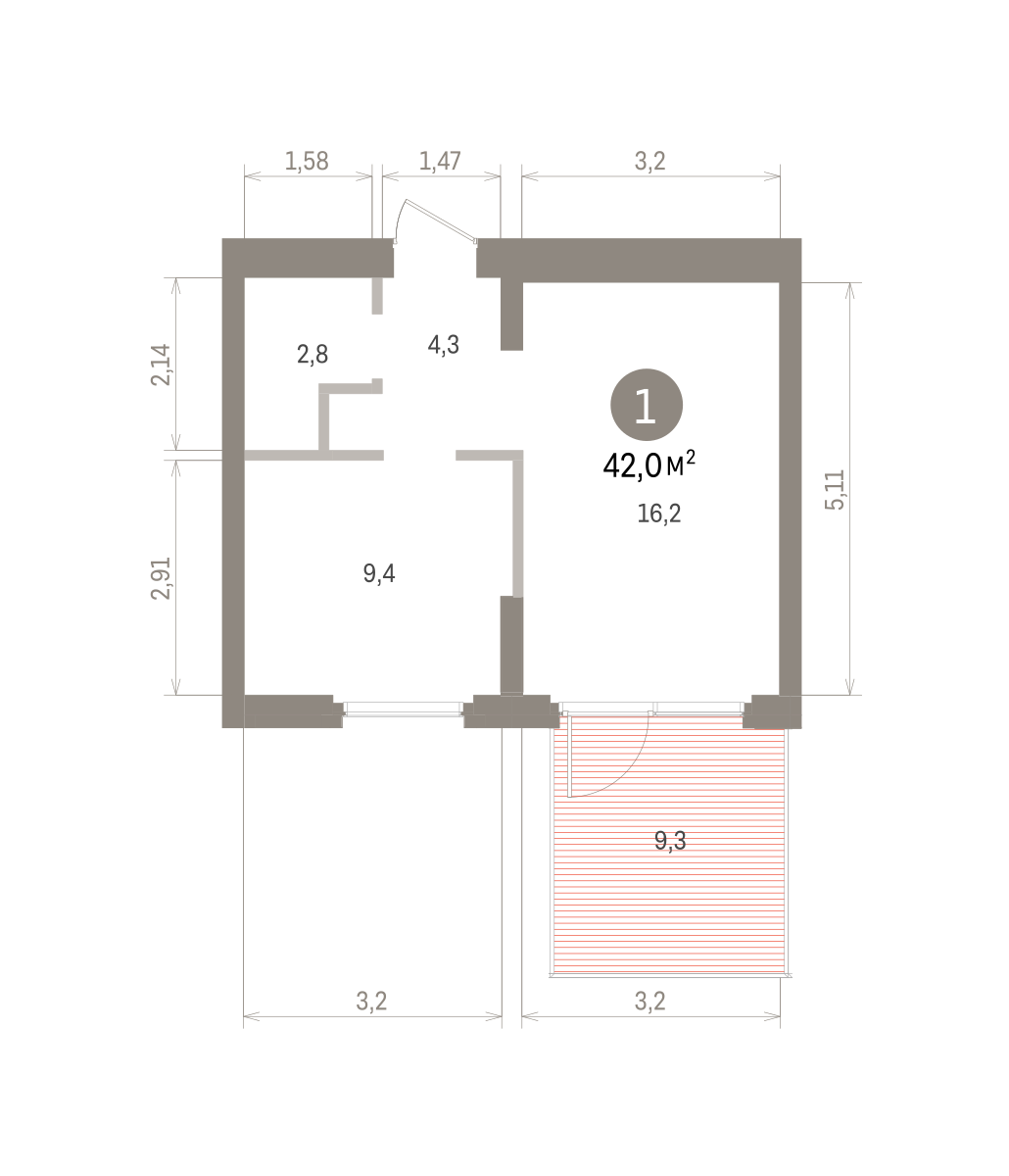 Квартира с кухней-гостиной и одной спальней в квартале «Траектория». Особенности планировки: вид во двор, предчистовая отделка, терраса. № квартиры в нашей базе: МНВ01-Ж7.2.7.