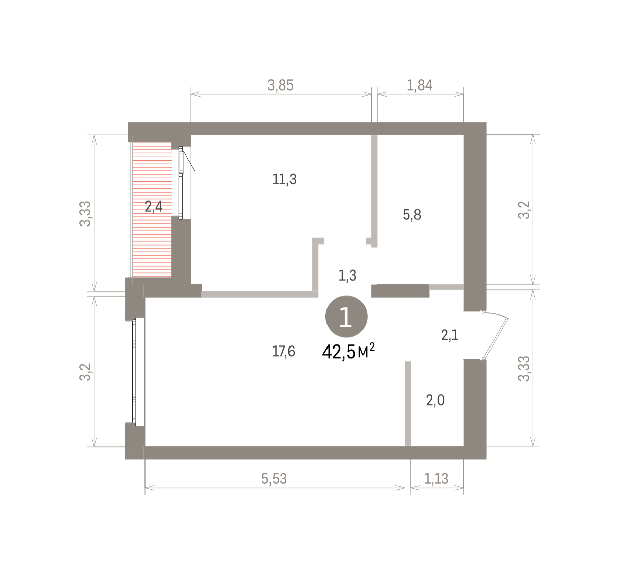 Квартира с кухней-гостиной и одной спальней в квартале «Траектория». Особенности планировки: гардеробная, лоджия, предчистовая отделка. № квартиры в нашей базе: МНВ01-Ж9.12.3.
