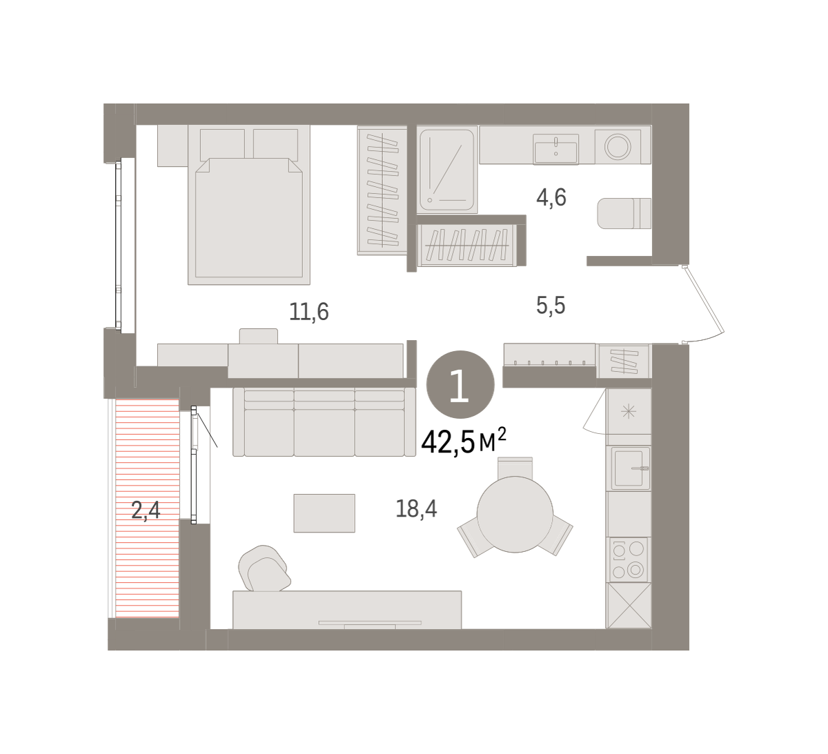 Квартира с кухней-гостиной и одной спальней в квартале «Траектория». Особенности планировки: лоджия, предчистовая отделка. № квартиры в нашей базе: МНВ01-Ж9.9.4.