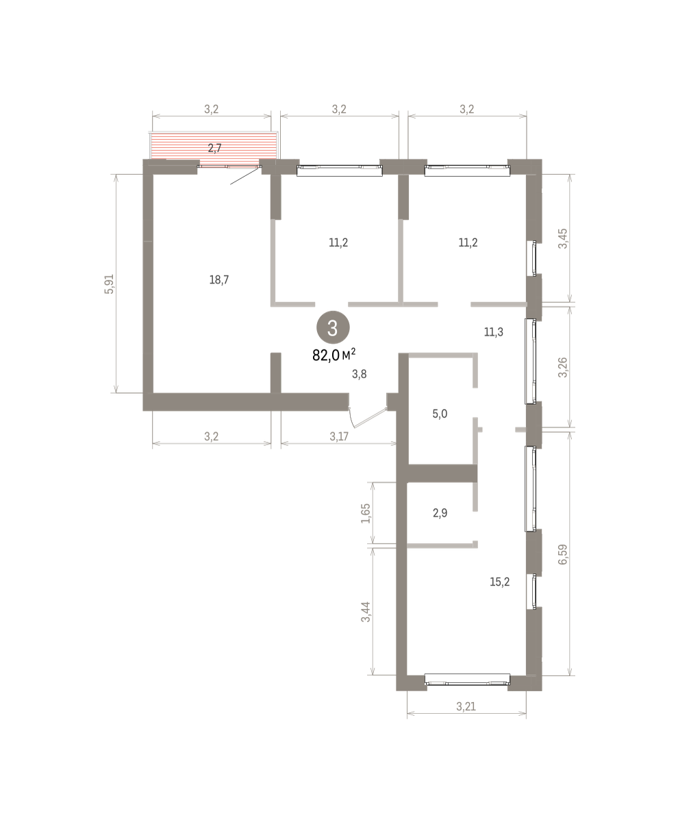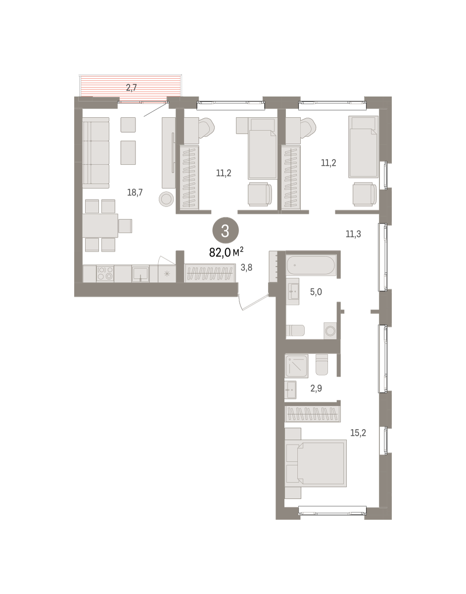 Квартира с кухней-гостиной и тремя спальнями в квартале «Траектория». Особенности планировки: балкон, вид во двор, гардеробная, мастер-спальня, предчистовая отделка, разнесённые спальни. № квартиры в нашей базе: МНВ01-Ж8.5.3.