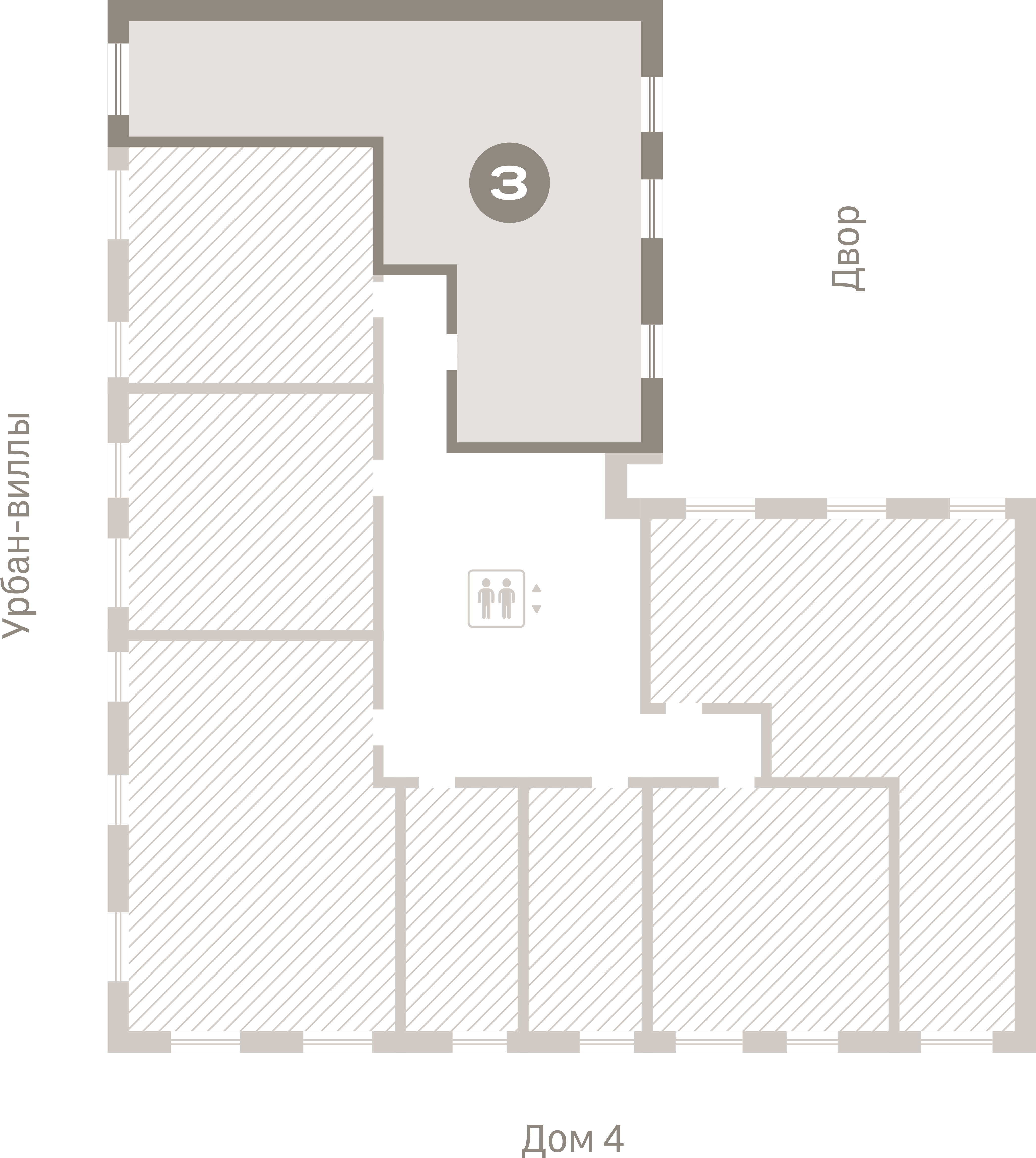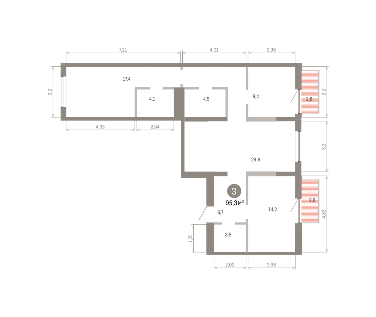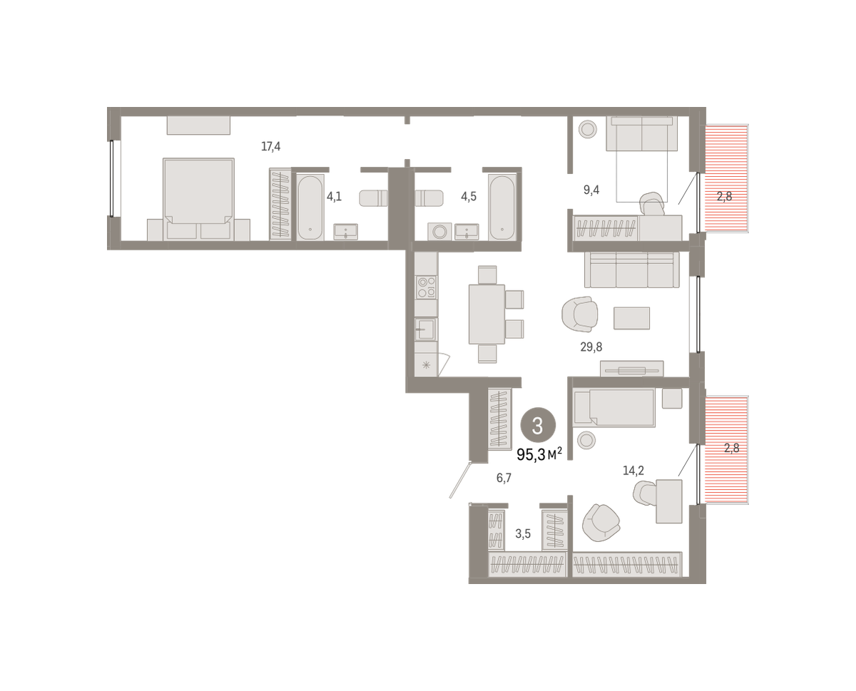 Квартира с кухней-гостиной и тремя спальнями в Южных кварталах. Особенности планировки: балкон, вид во двор, гардеробная, мастер-спальня, окна на две стороны, предчистовая отделка, разнесённые спальни.