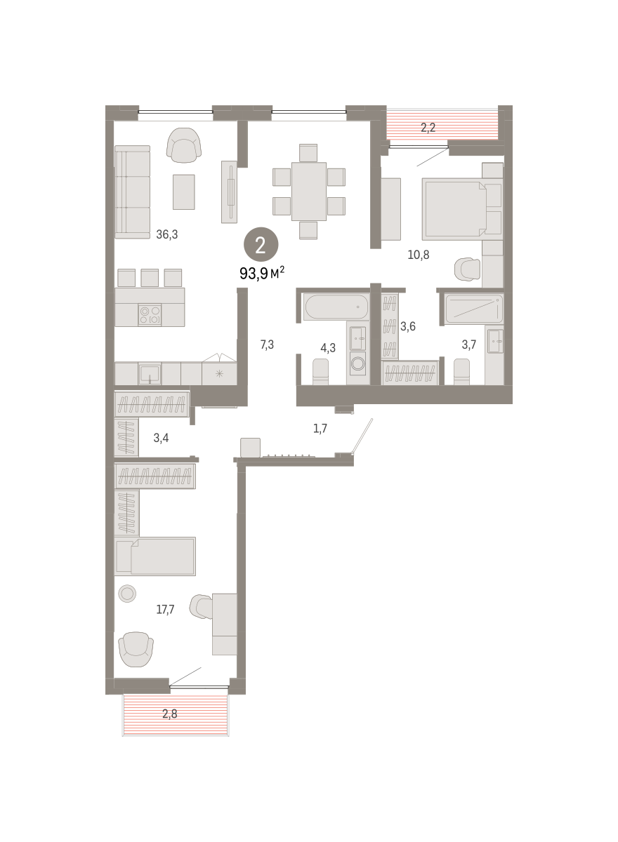 Квартира с кухней-гостиной и двумя спальнями в Южных кварталах. Особенности планировки: балкон, вид во двор, гардеробная, лоджия, мастер-спальня, окна на две стороны, предчистовая отделка, разнесённые спальни.