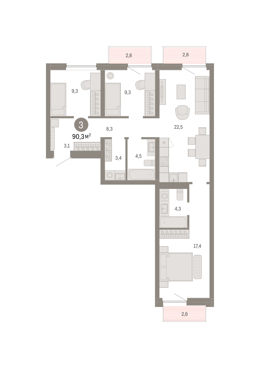 Квартира с кухней-гостиной и тремя спальнями в Южных кварталах. Особенности планировки: балкон, вид во двор, мастер-спальня, окна на две стороны, постирочная, предчистовая отделка, разнесённые спальни.