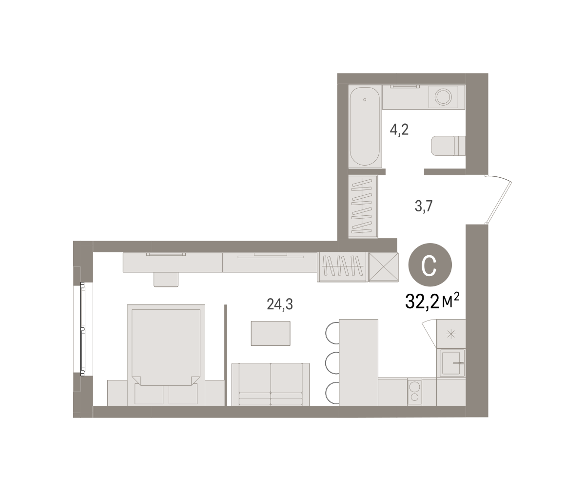 Студия в Южных кварталах. Особенности планировки: предчистовая отделка. № квартиры в нашей базе: ЮКВ08-Ж1.8.4.