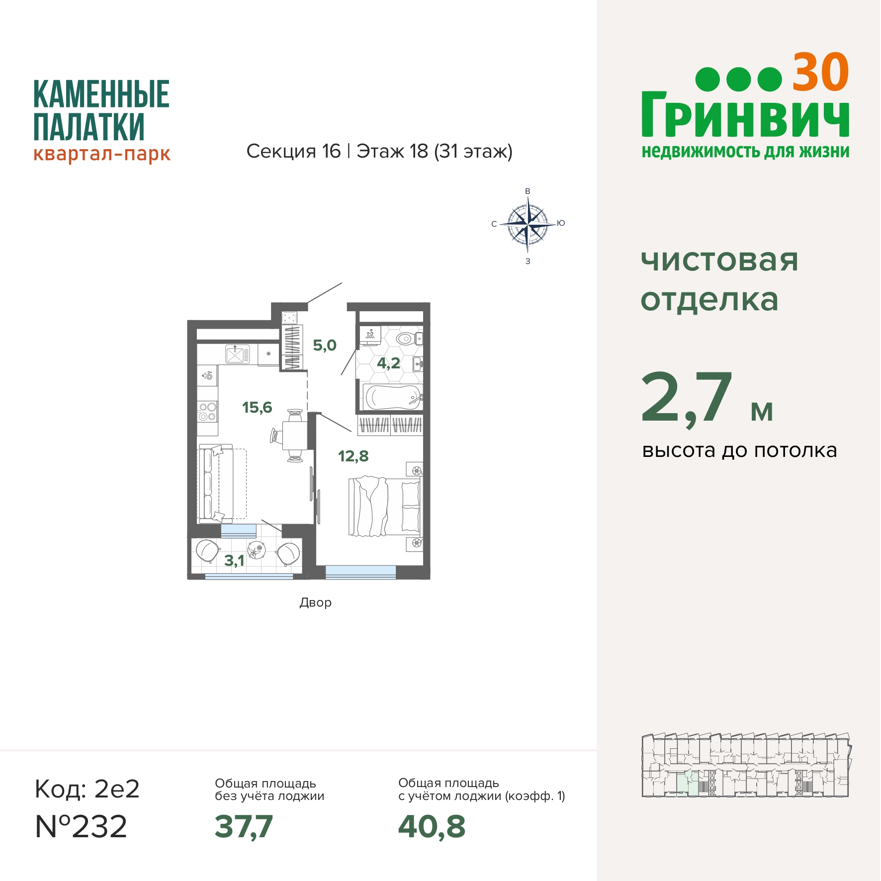 • Высокие потолки (2,7 м);