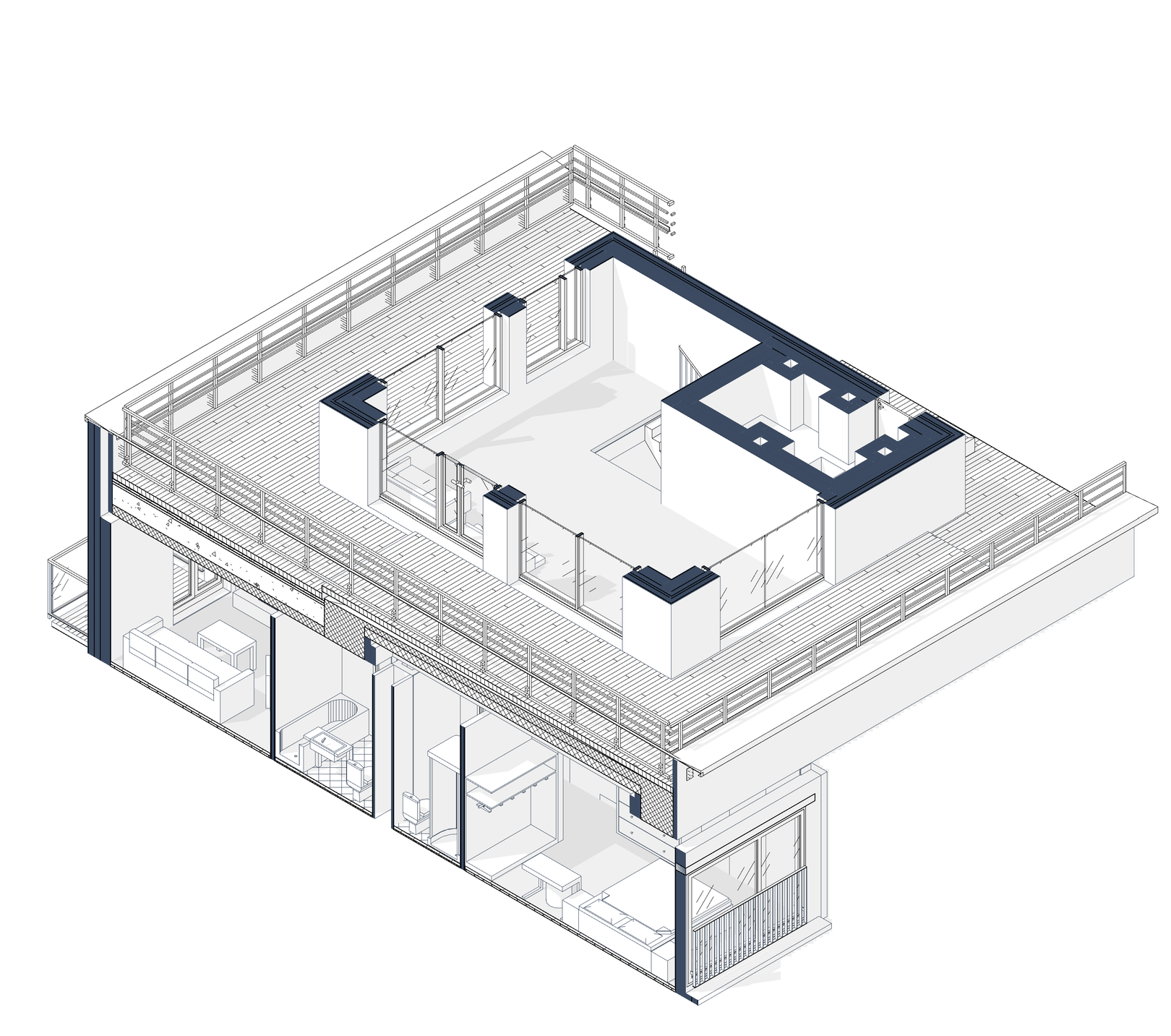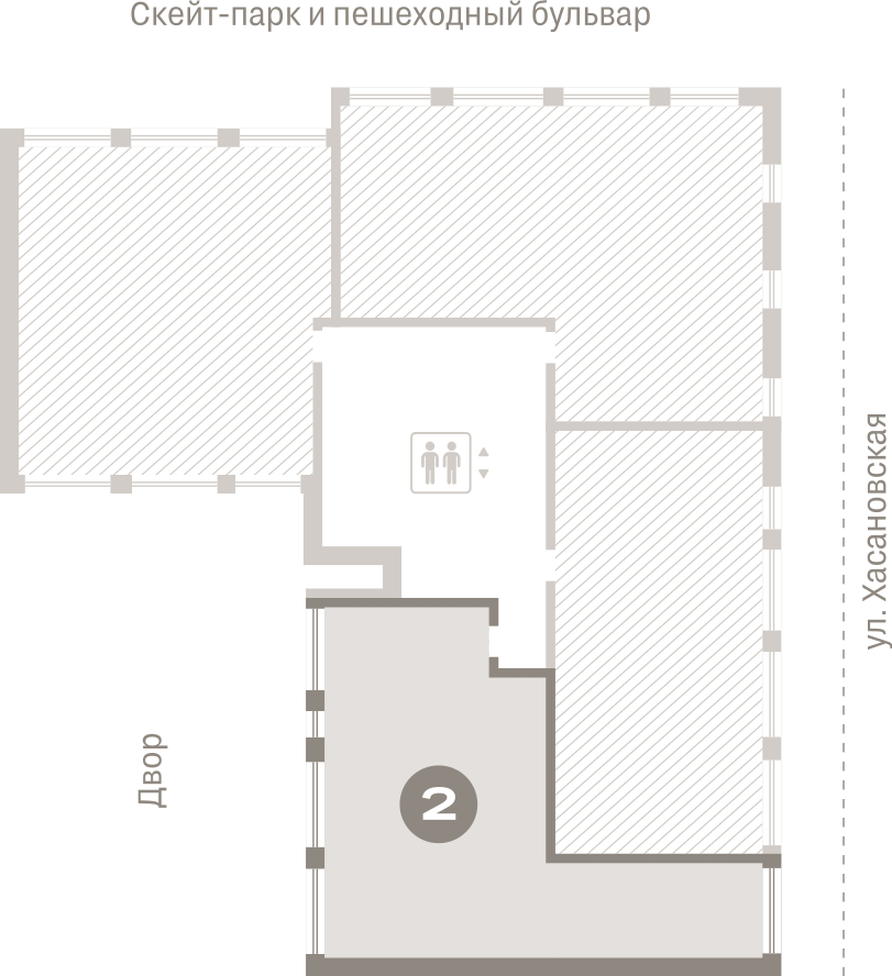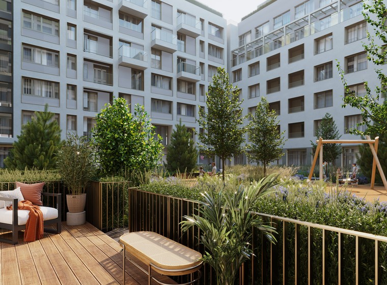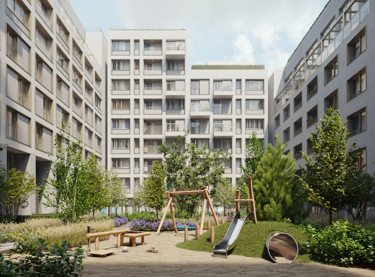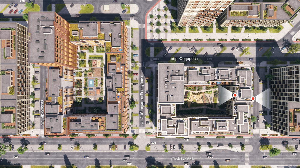 Двор закрыт от машин и оформлен в стиле скандинавского натурализма. Он похож на парк, сформировавшийся без участия человека и сохраняющий обаяние в течение всего года. Под домом запроектирован подземный паркинг, а также кладовые для хранения сезонных вещей.
