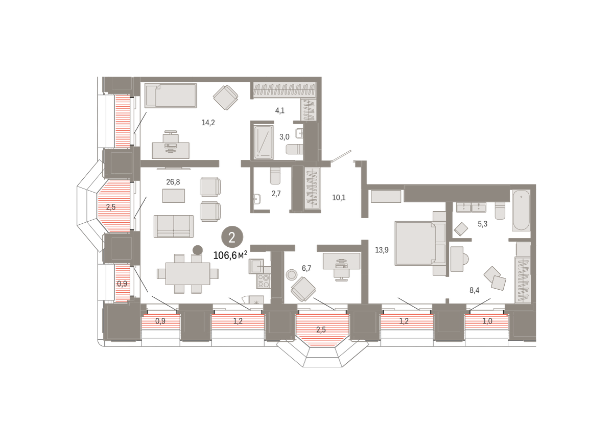 Квартира с кухней-гостиной и двумя спальнями в квартале «На Некрасова». Особенности планировки: второй санузел, лоджия, мастер-спальня, предчистовая отделка, рабочий кабинет, разнесённые спальни.