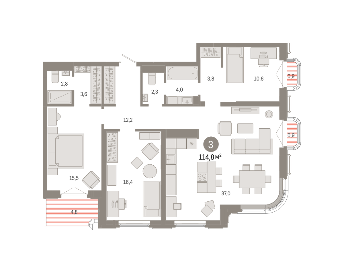 Квартира с кухней-гостиной и тремя спальнями в квартале «На Некрасова». Особенности планировки: балкон, второй санузел, лоджия, мастер-спальня, предчистовая отделка, разнесённые спальни. № квартиры в нашей базе: НКР02-Ж2.8.4.