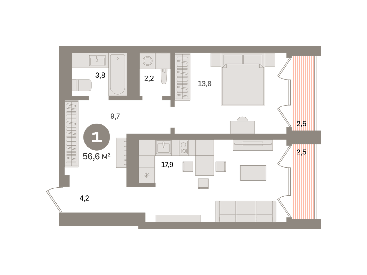 В однокомнатной квартире в «Южных кварталах» спроектированы просторная кухня-гостиная, спальня и ванная комната, предусмотрены ниши для хранения одежды и обуви. Купить однокомнатную квартиру в районе Южного автовокзала в Екатеринбурге выгодно напрямую от застройщика Брусника.