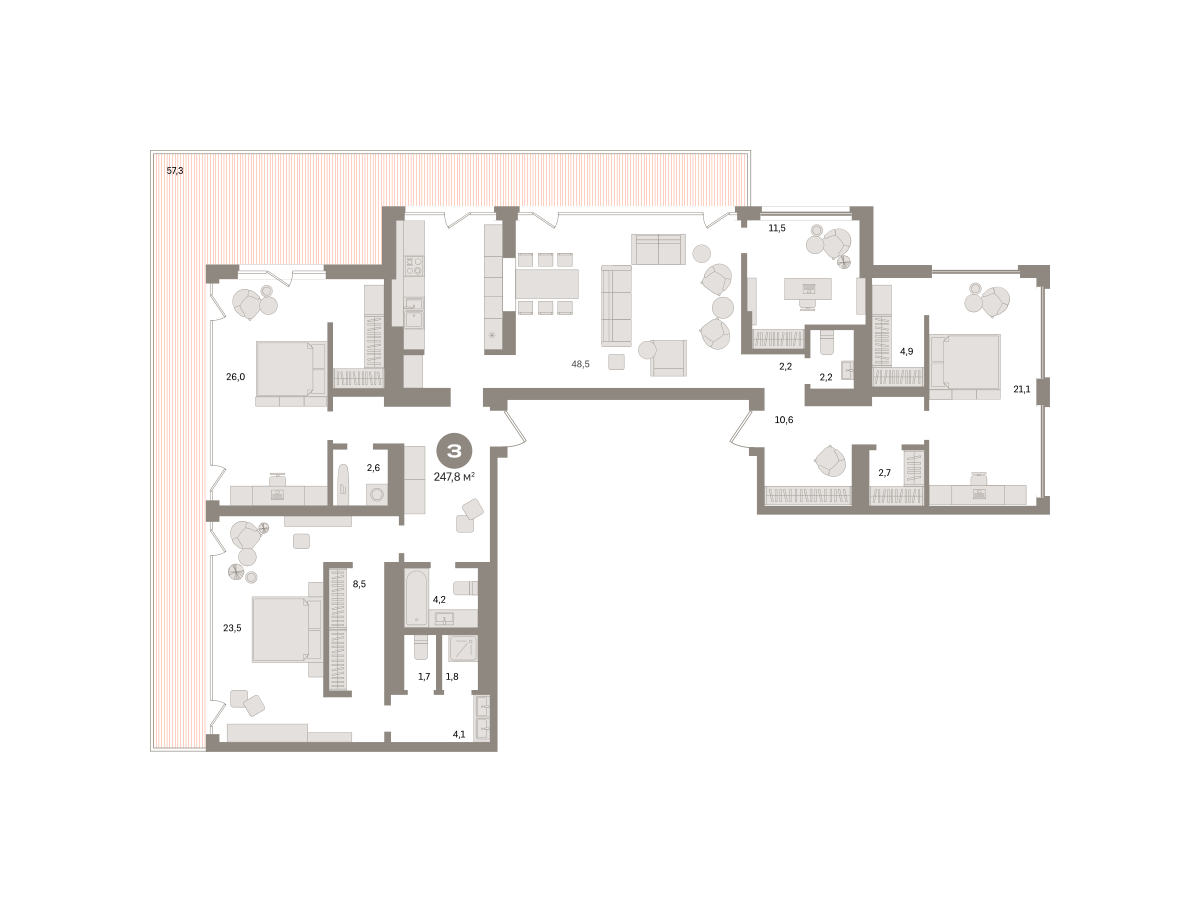 Квартира с кухней-гостиной и тремя спальнями в Южных кварталах. Особенности планировки: вид во двор, второй санузел, гардеробная, мастер-спальня, окна в пол, постирочная, предчистовая отделка, рабочий кабинет, разнесённые спальни, терраса на крыше.