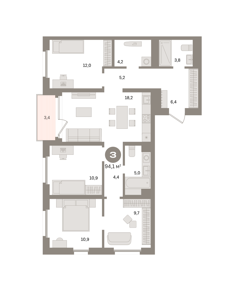 Квартира с кухней-гостиной и тремя спальнями в Южных кварталах. Особенности планировки: вид во двор, второй санузел, гардеробная, постирочная, предчистовая отделка, разнесённые спальни, терраса.
