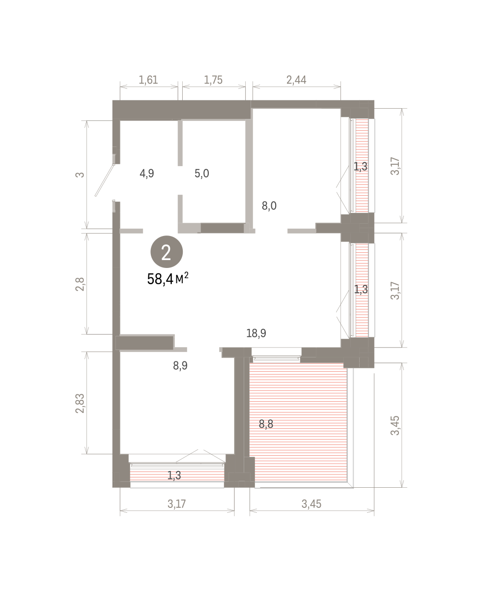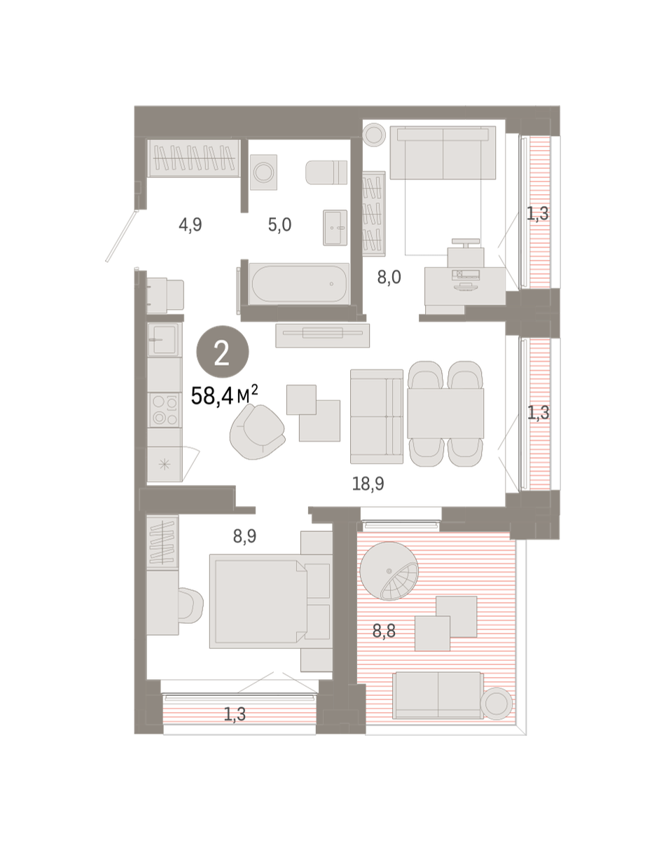 Квартира с кухней-гостиной и двумя спальнями в районе Шишимская горка. Особенности планировки: предчистовая отделка, разнесённые спальни, терраса на крыше. № квартиры в нашей базе: ШГР16-Ж5.16.2.
