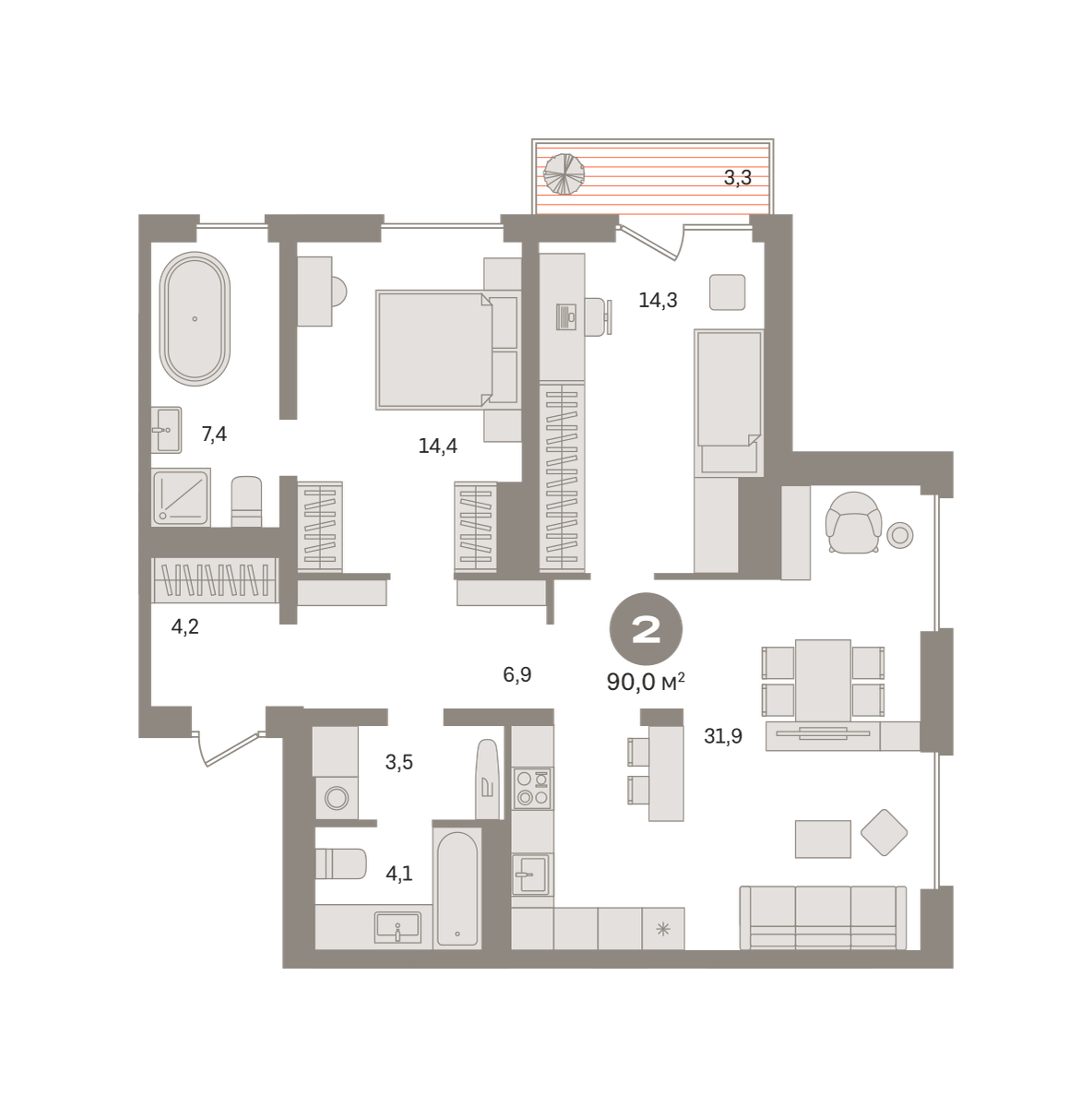 Квартира с кухней-гостиной и двумя спальнями в Северном квартале. Особенности планировки: балкон, вид во двор, второй санузел, гардеробная, мастер-спальня, окно в санузле, постирочная, предчистовая отделка.