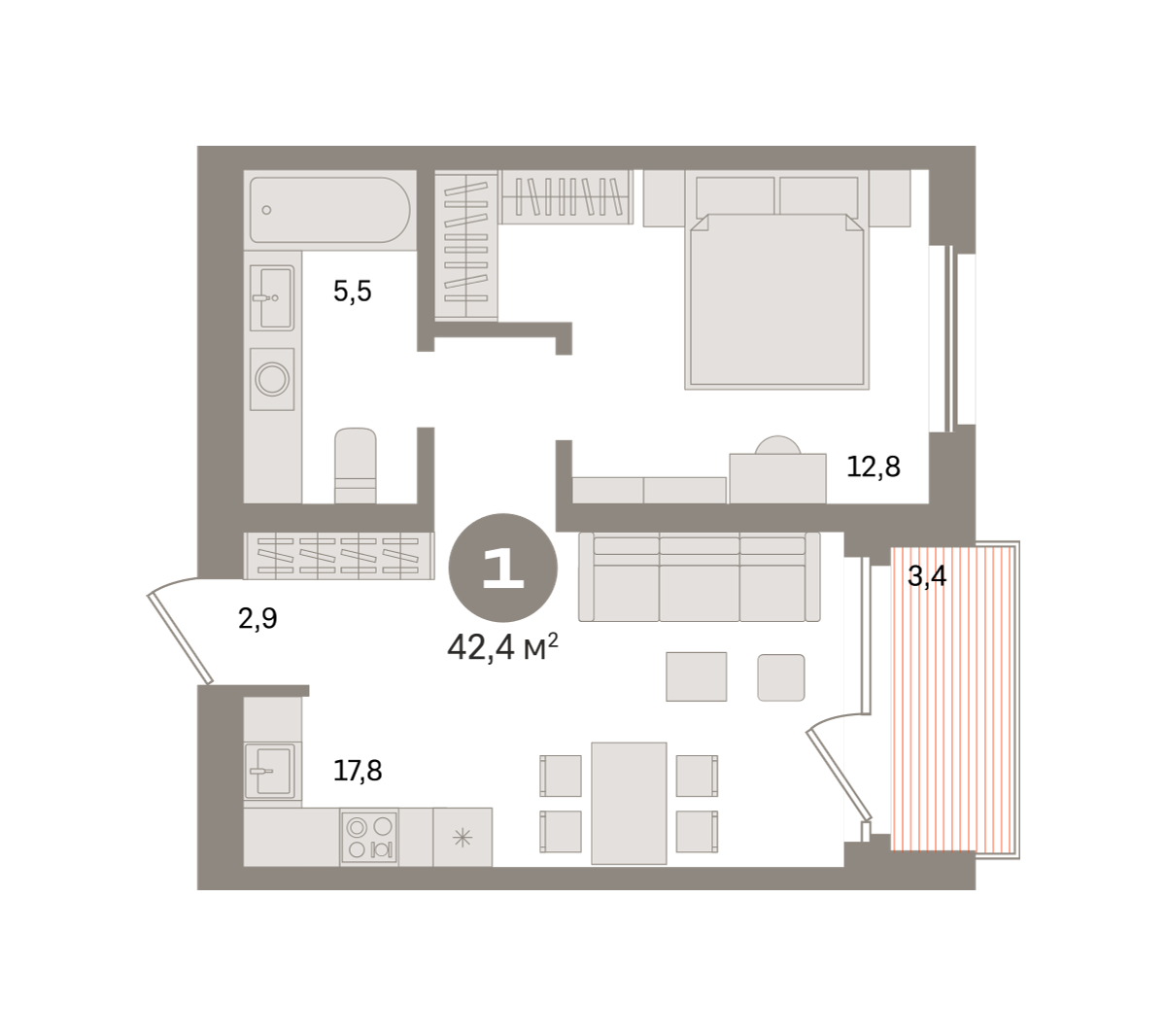 Квартира с кухней-гостиной и одной спальней в Южных кварталах. Особенности планировки: предчистовая отделка, терраса.