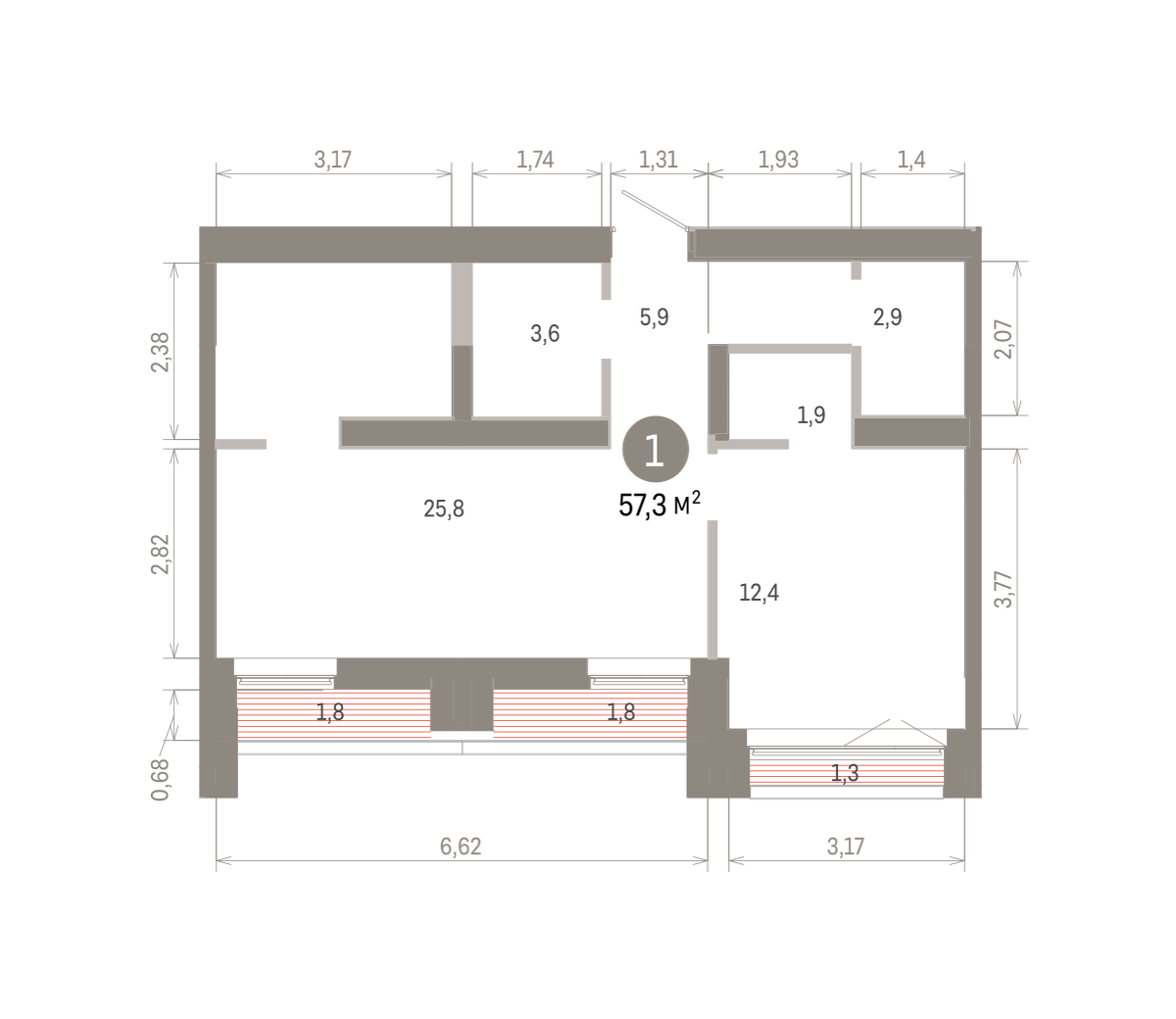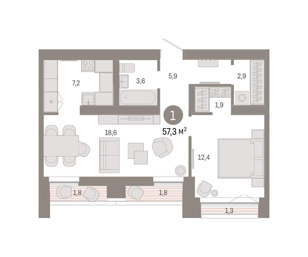 Квартира с кухней-гостиной и одной спальней в районе Шишимская горка. Особенности планировки: гардеробная, лоджия, предчистовая отделка. № квартиры в нашей базе: ШГР16-Ж5.16.3.
